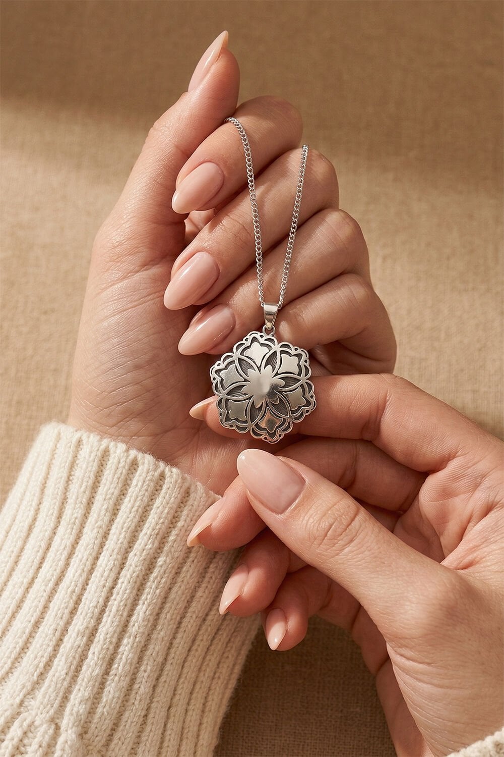 Eksiksiz Set: 27x27 mm ideal boyutlardaki kolye ucu, 55 cm uzunluğunda şık bir gümüş zincir ile birlikte gönderilmektedir.