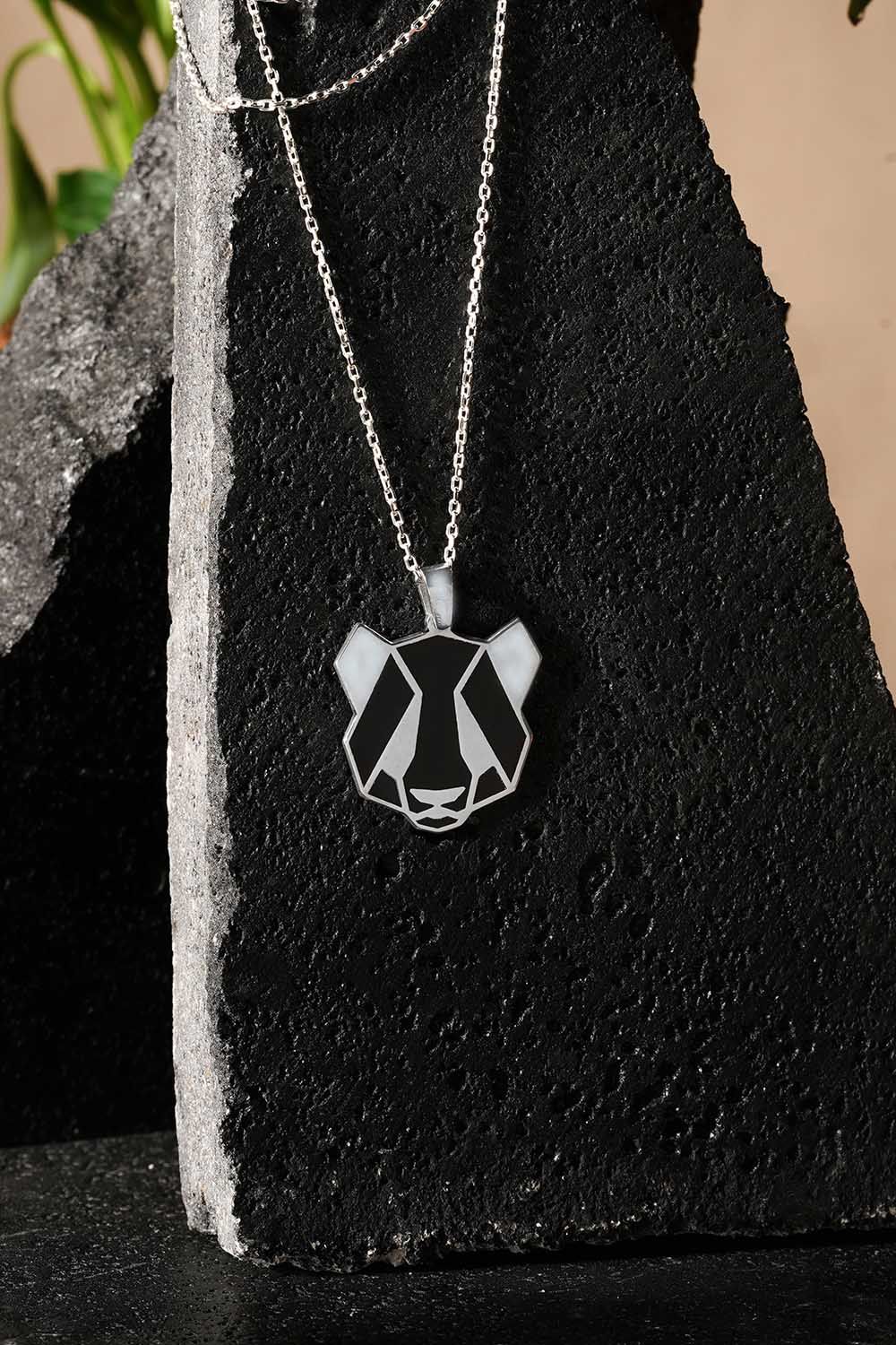 Panda Model Geometrik Siyah Mineli 925 Ayar Gümüş Kolye