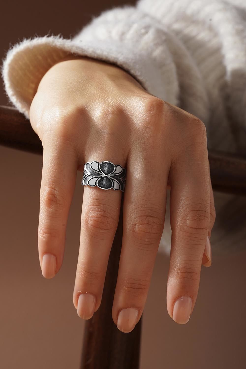 Papatya Desenli Ayarlanabilir Altı Açık Gümüş Kadın Yüzük