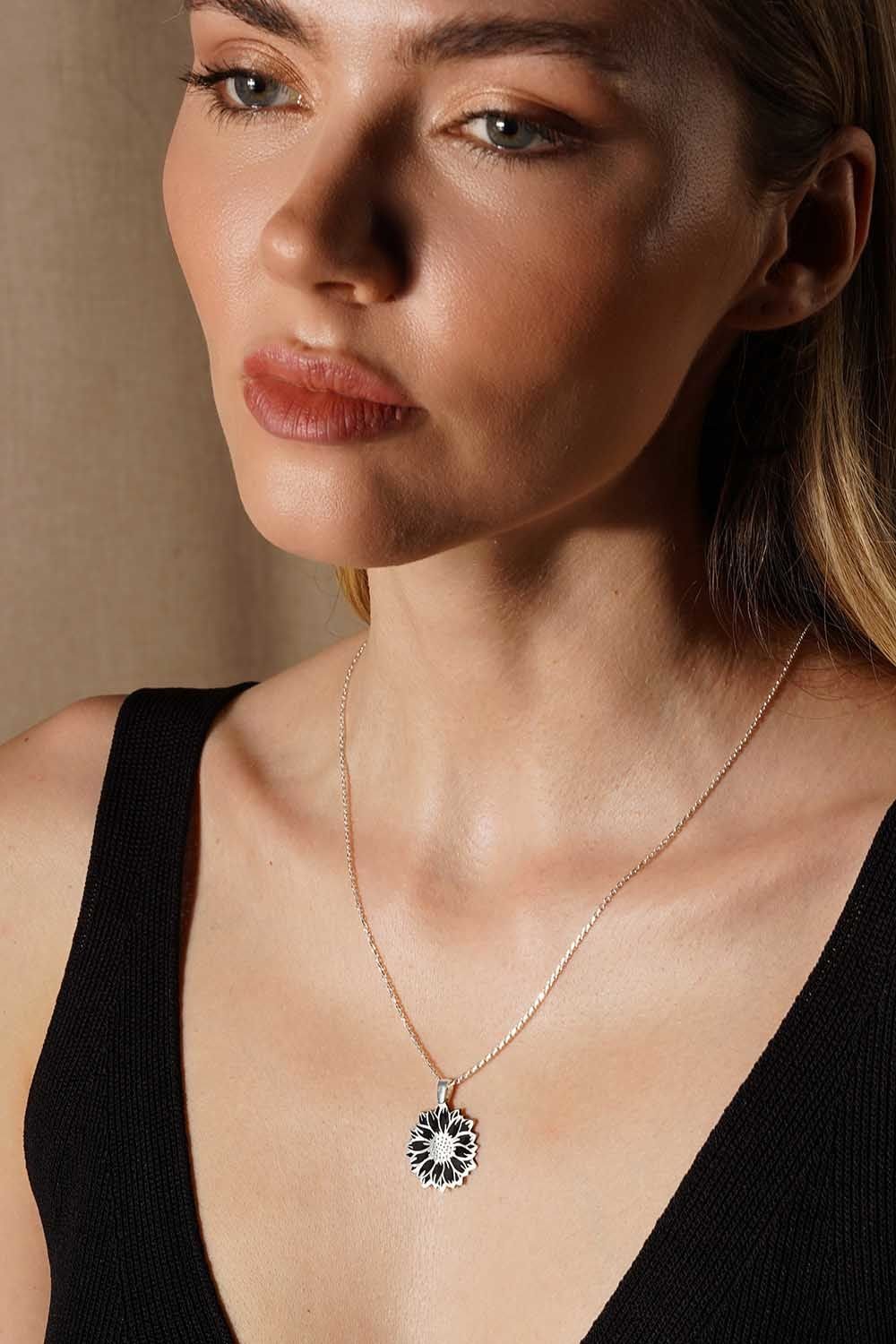 Papatya Model Siyah Mineli Gümüş Kolye |