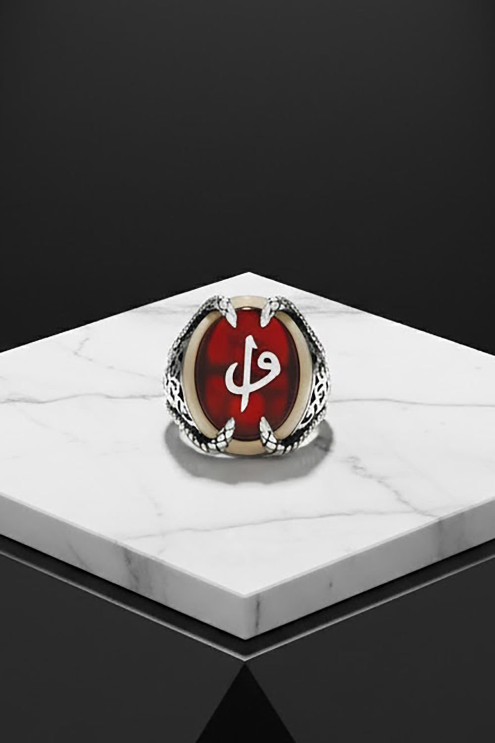 Bu özel erkek yüzüğü, doğal akik taşı ve 925 ayar gümüş ile özenle tasarlanmıştır. Pençe modeli ve vav elif deseniyle benzersiz bir görünüm sunar.