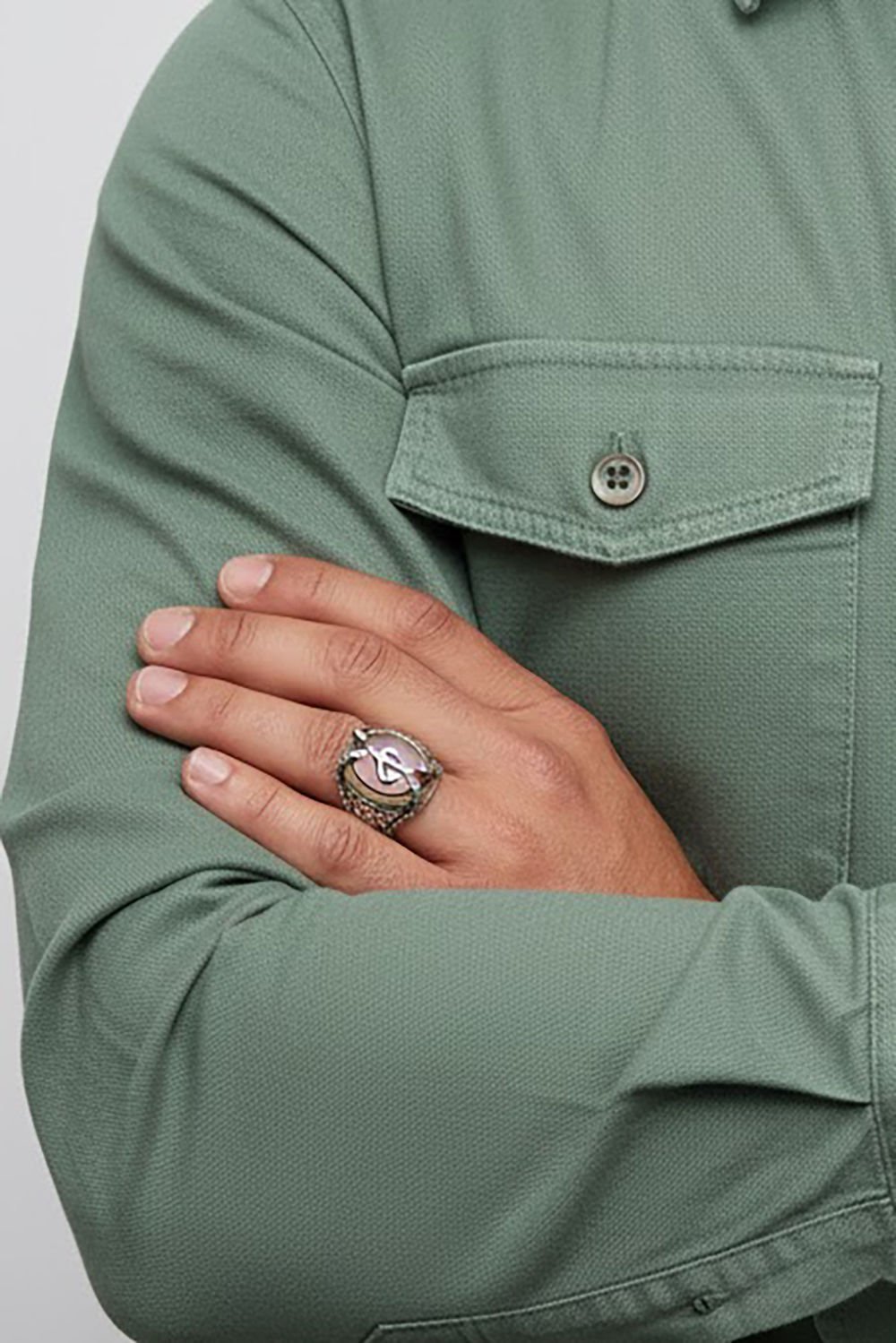 Bu yüzük, deneyimli zanaatkarlar tarafından elde işlenmiş ve her bir detayı özenle şekillendirilmiştir. Pençe modeli ve vav elif deseni detayıyla dikkat çeker.