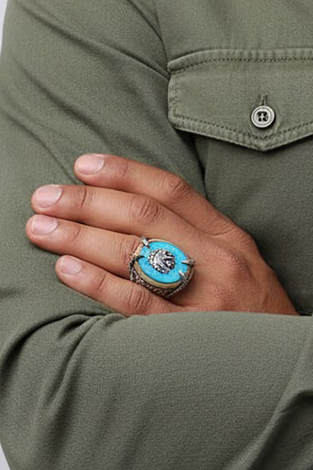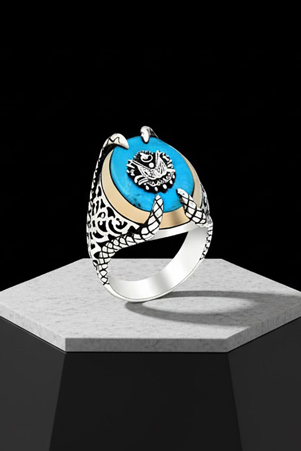 Bu özel erkek yüzüğü, doğal firuze taşı ve 925 ayar gümüş ile özenle tasarlanmıştır. Pençe modeli ve devlet arması deseniyle benzersiz bir görünüm sunar.