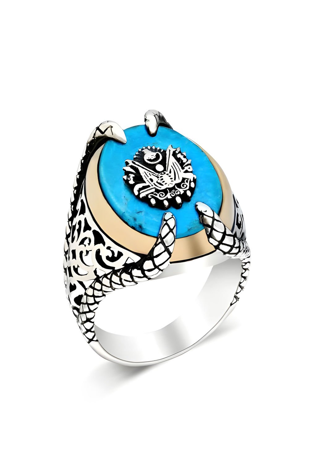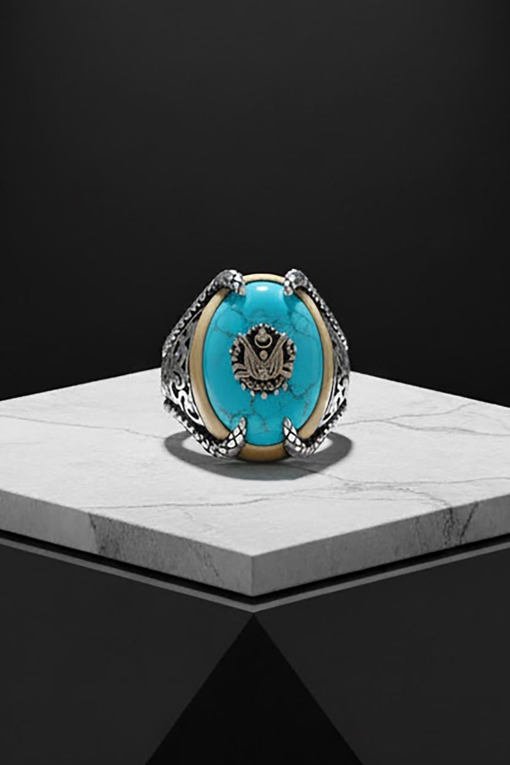 Natural Firuze Taşlı Pençe Model Erkek Yüzük - El İşçiliği, 925 Ayar Gümüş, Özel Tasarım, Devlet Arması Desenli