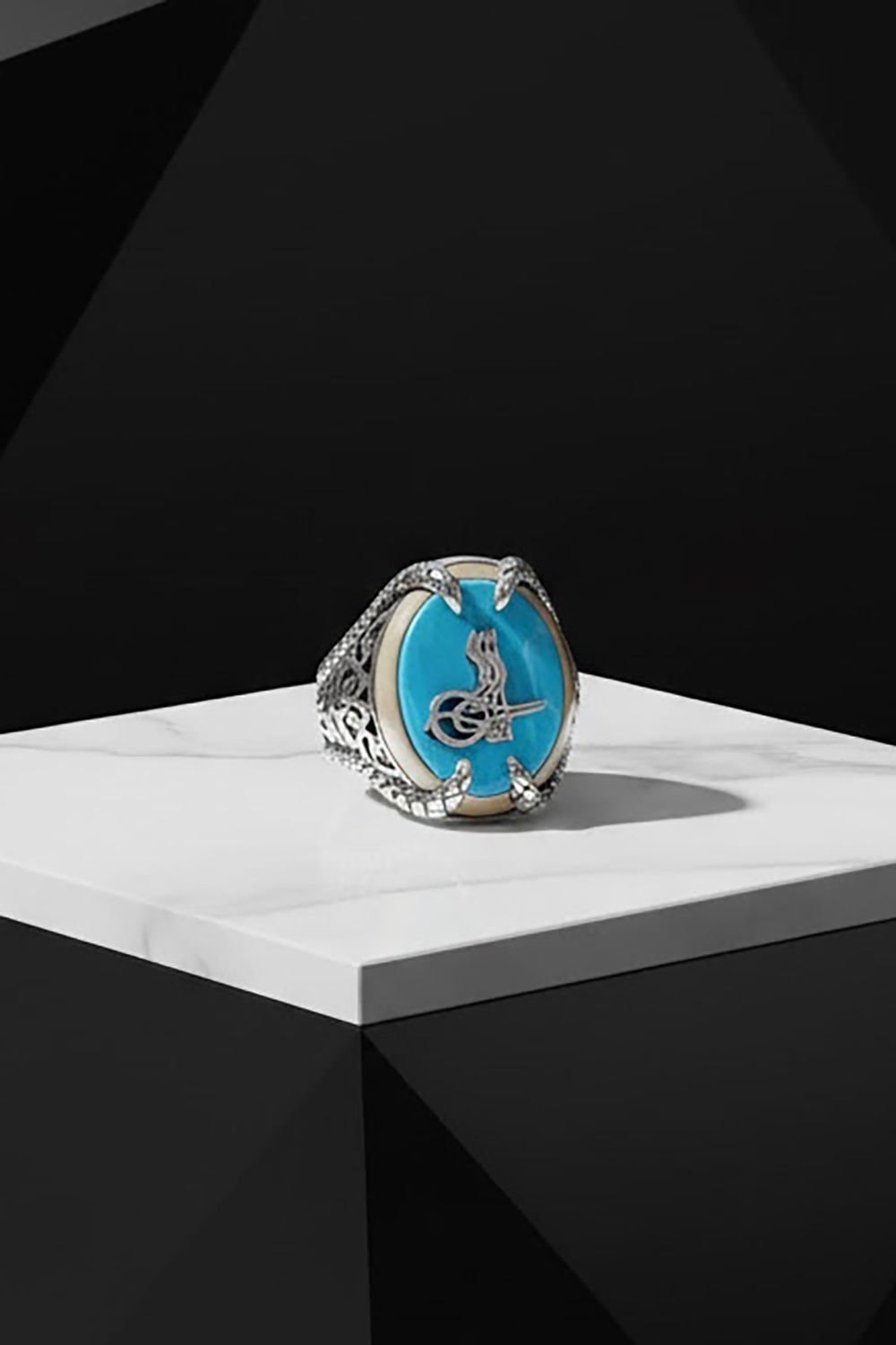 Bu özel erkek yüzüğü, doğal firuze taşı ve 925 ayar gümüş ile özenle tasarlanmıştır. Pençe modeli ve tuğra deseniyle benzersiz bir görünüm sunar.