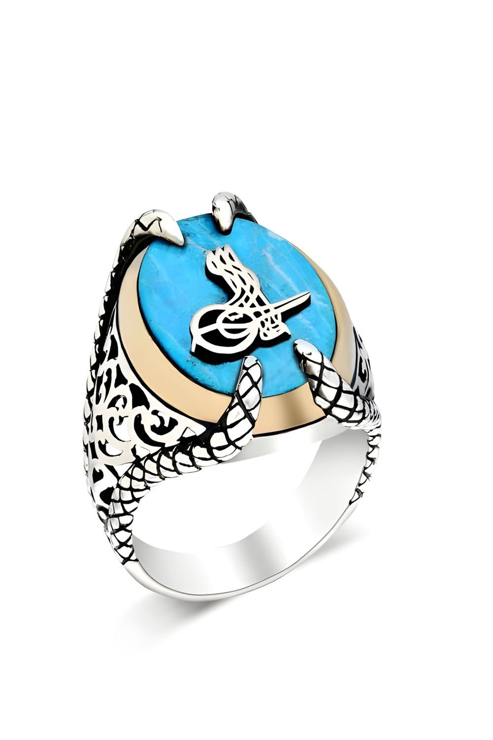 Natural Firuze Taşlı Pençe Model Erkek Yüzük - El İşçiliği, 925 Ayar Gümüş, Özel Tasarım, Tuğra Desenli