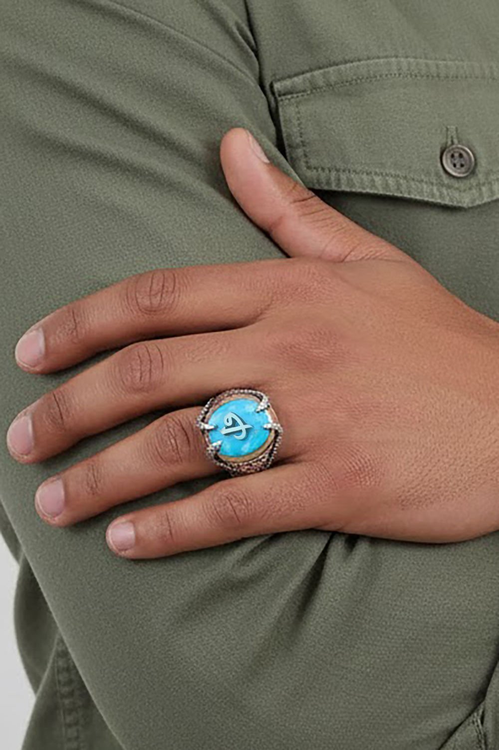 Bu özel erkek yüzüğü, doğal firuze taşı ve 925 ayar gümüş ile özenle tasarlanmıştır. Pençe modeli ve vav elif deseniyle benzersiz bir görünüm sunar.