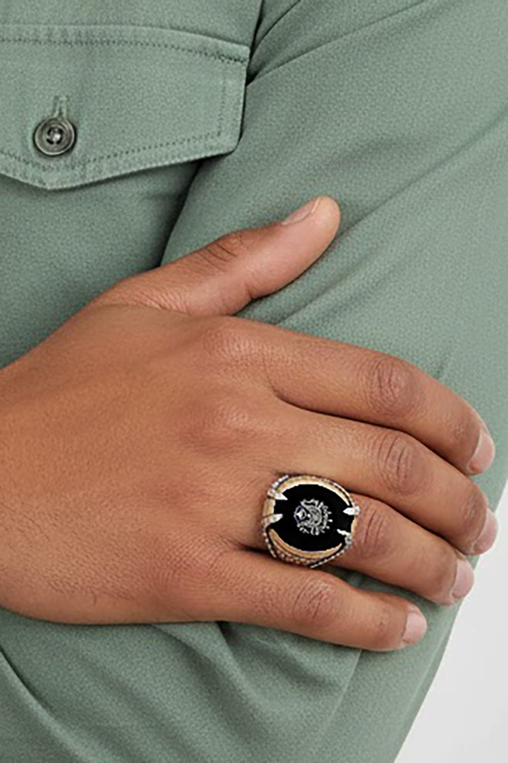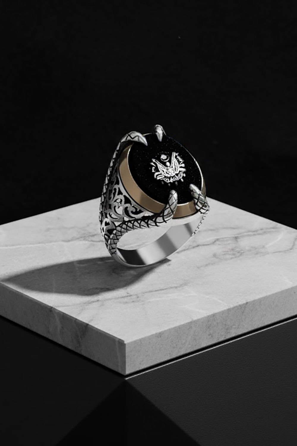 Bu yüzük, deneyimli zanaatkarlar tarafından elde işlenmiş ve her bir detayı özenle şekillendirilmiştir. Pençe modeli ve devlet arması deseni detayıyla dikkat çeker.