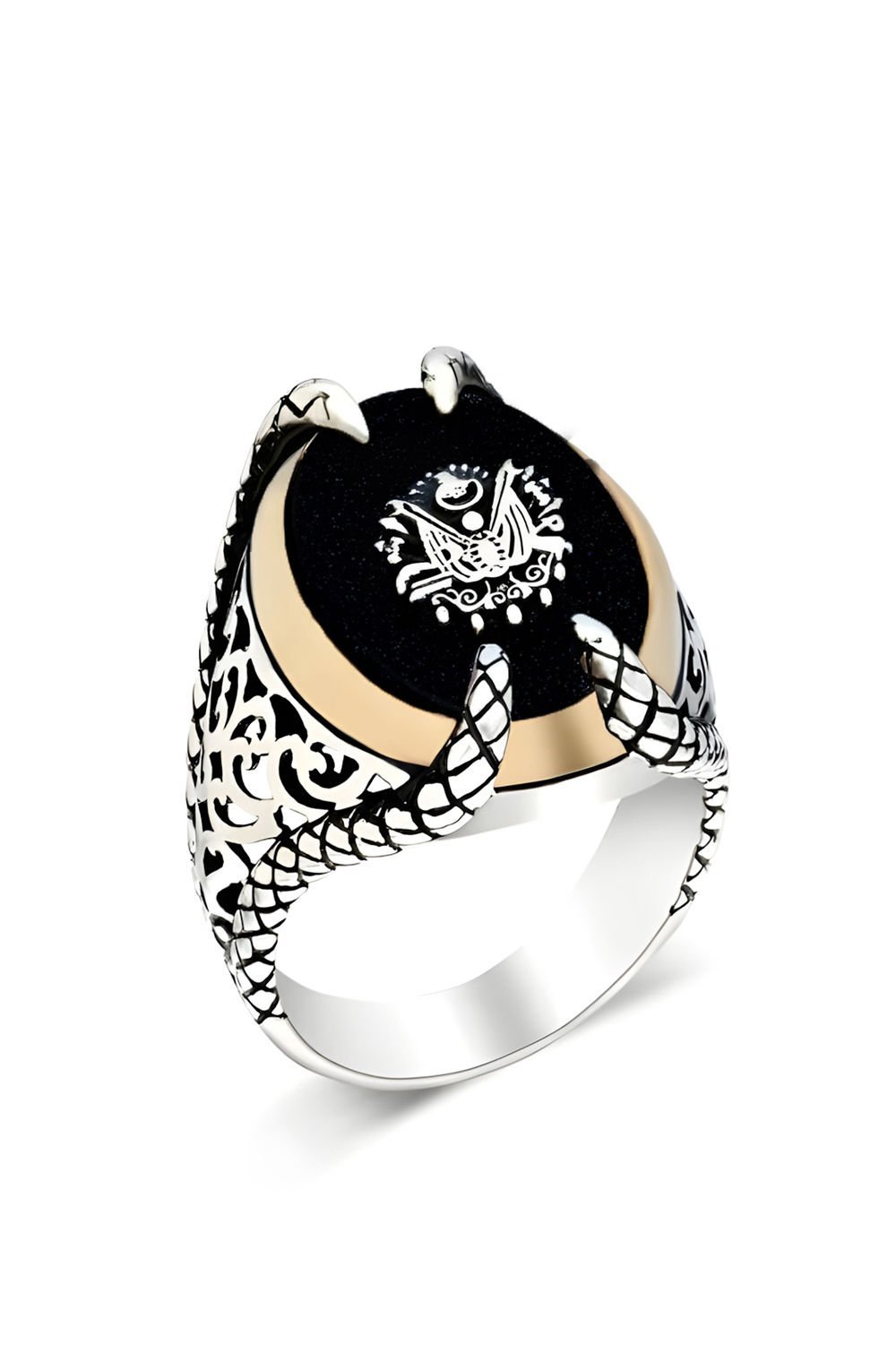Doğal Oniks Taşlı El İşçiliği 925 Ayar Gümüş Erkek Yüzük - Pençe Model, Devlet Arması Desenli