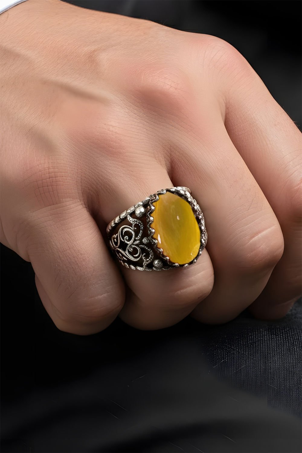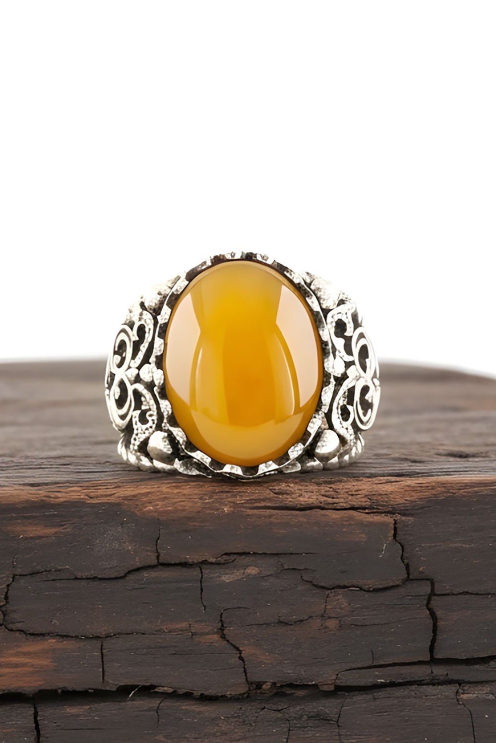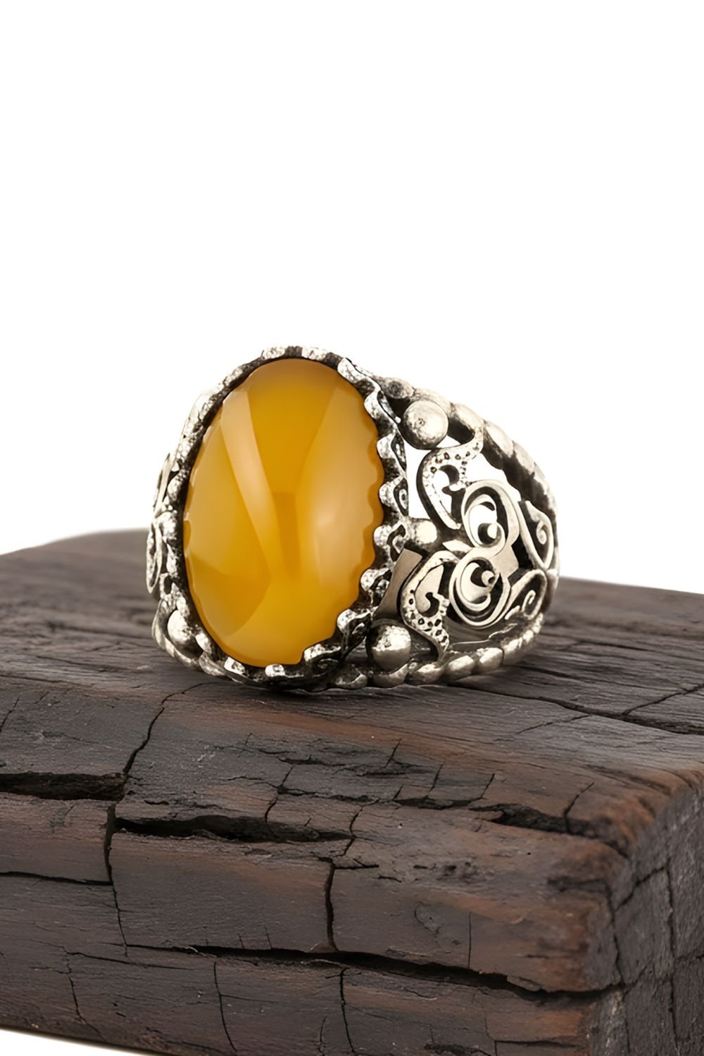 Doğal Sarı Akik Taşlı Usta İşçilik Gümüş Erkek Yüzük