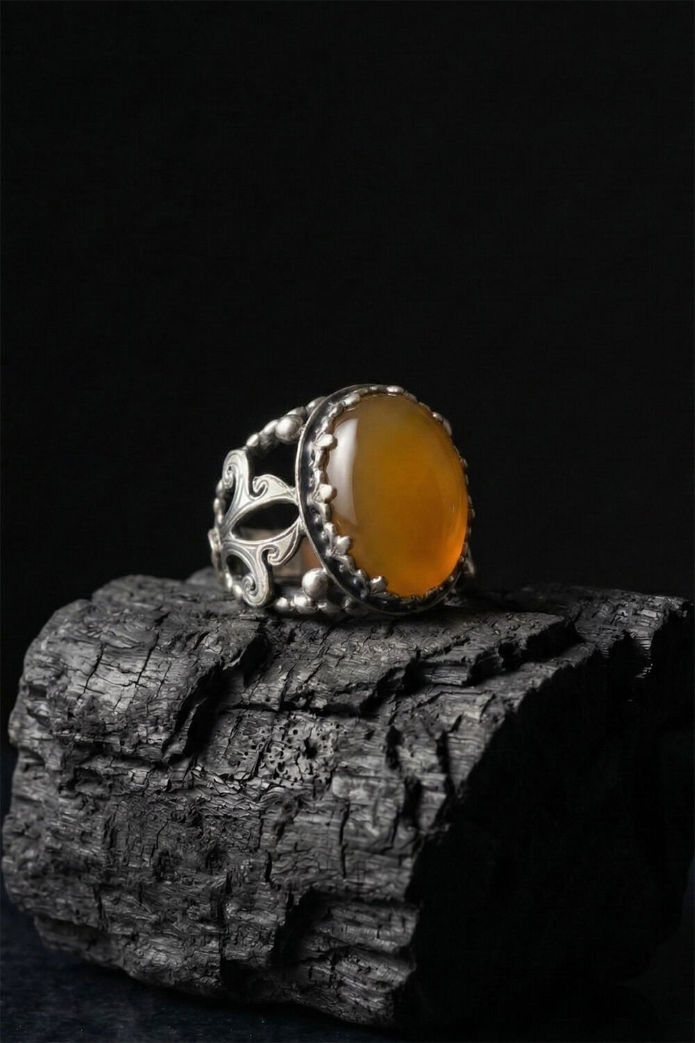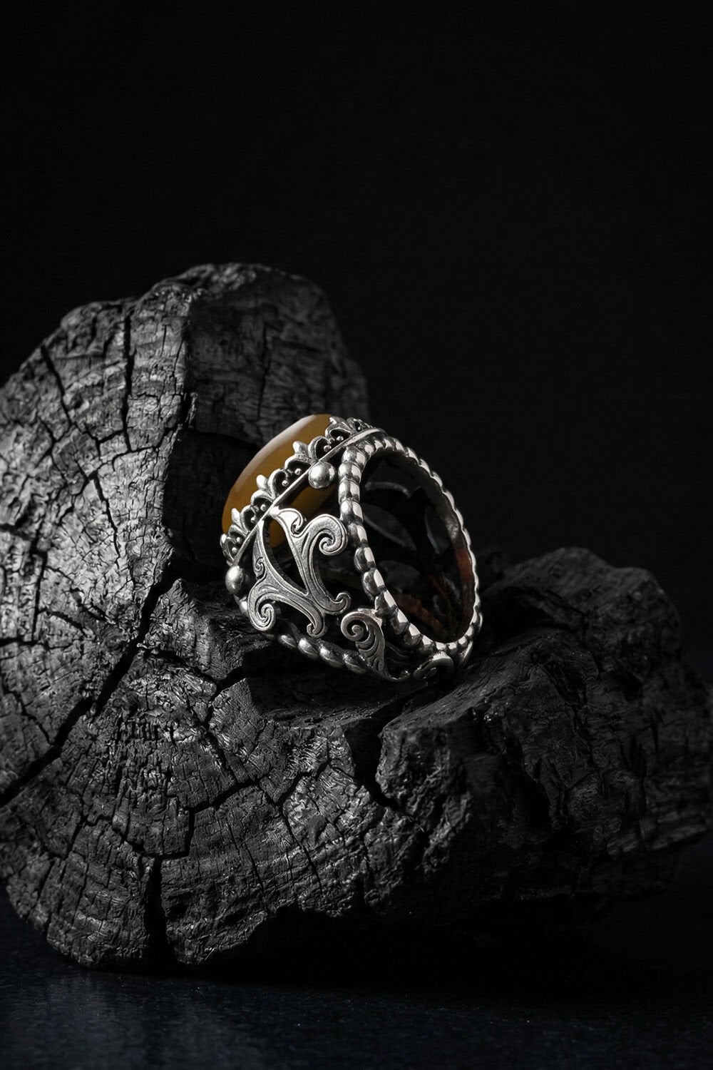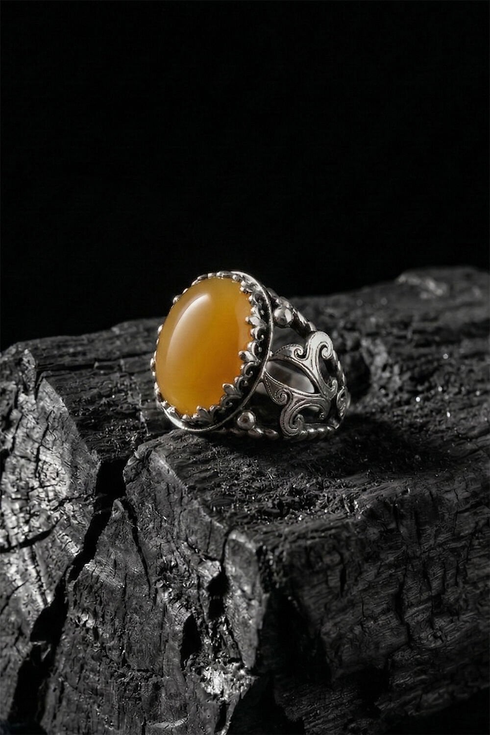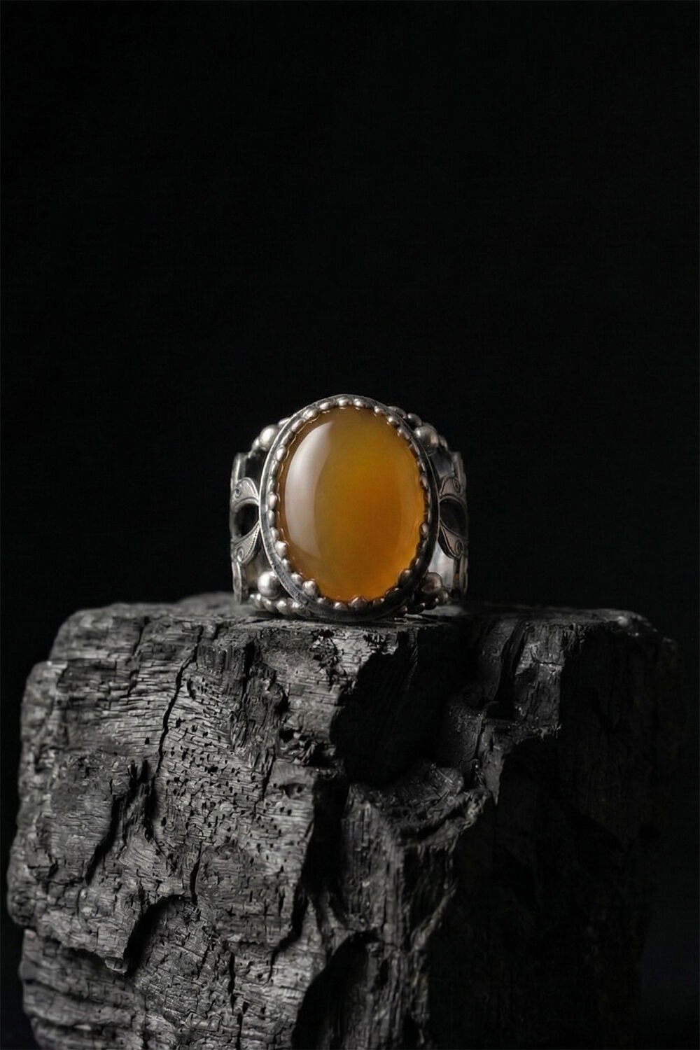 Zarafeti ve ustalığı parmağınızda taşıyın! Tamamen el işçiliği ile hayat bulan bu özel tasarım erkek yüzüğü, 925 ayar gümüşün kalitesini sarı akik taşının doğal enerjisiyle birleştiriyor.