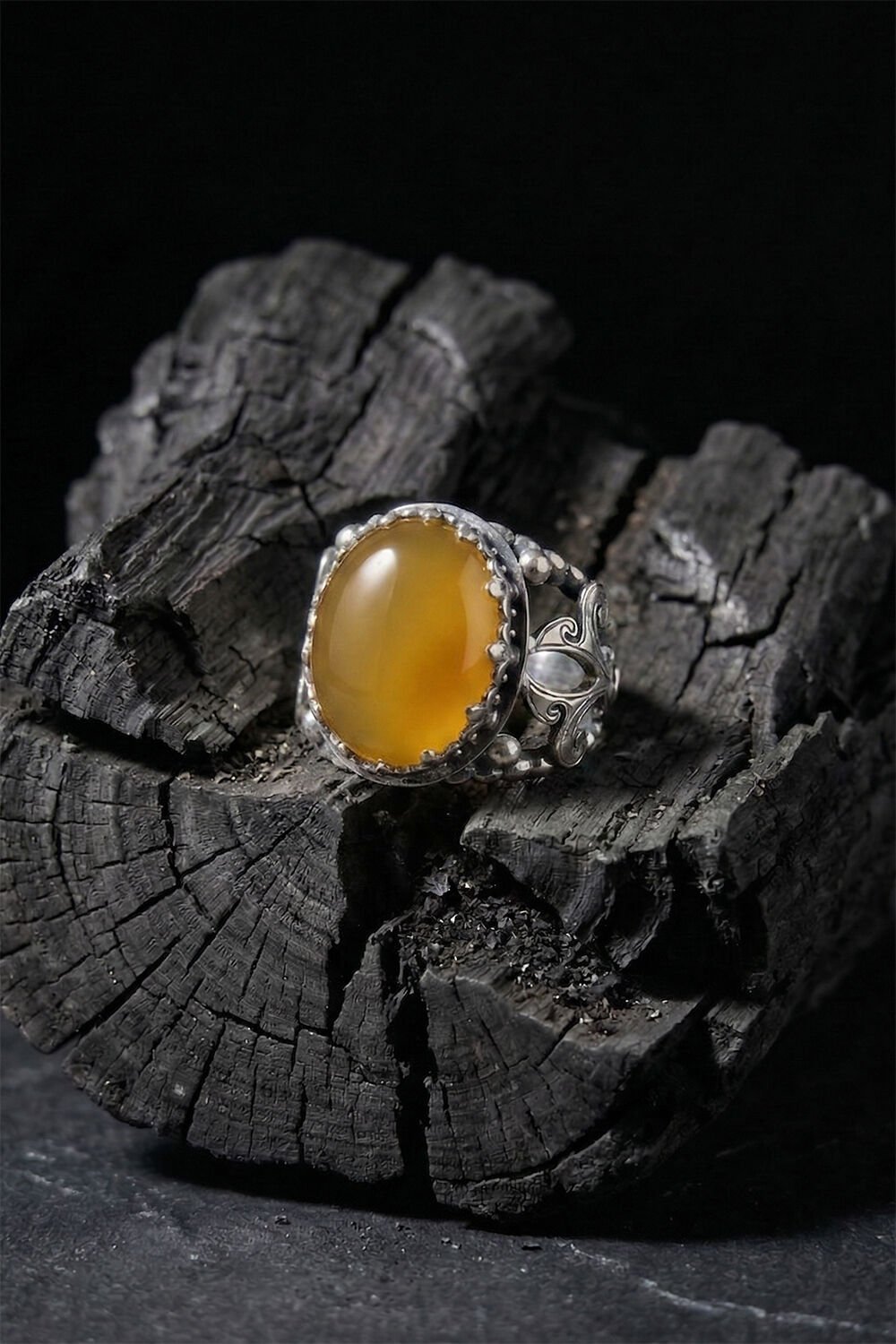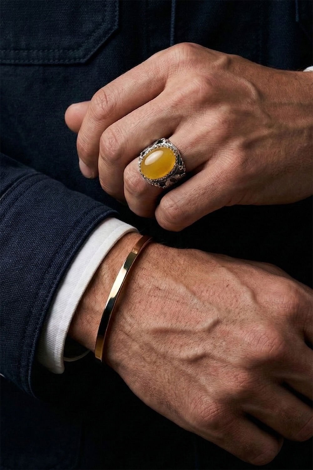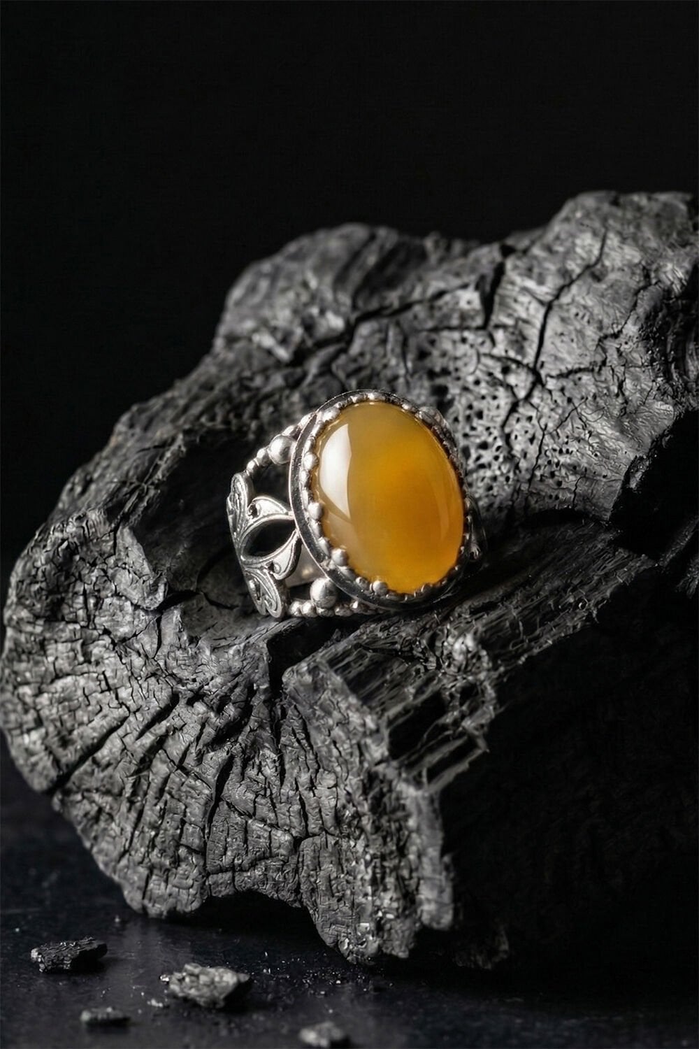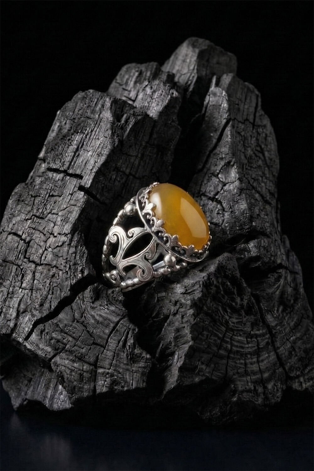 Zarafeti ve ustalığı parmağınızda taşıyın! Tamamen el işçiliği ile hayat bulan bu özel tasarım erkek yüzüğü, 925 ayar gümüşün kalitesini sarı akik taşının doğal enerjisiyle birleştiriyor.