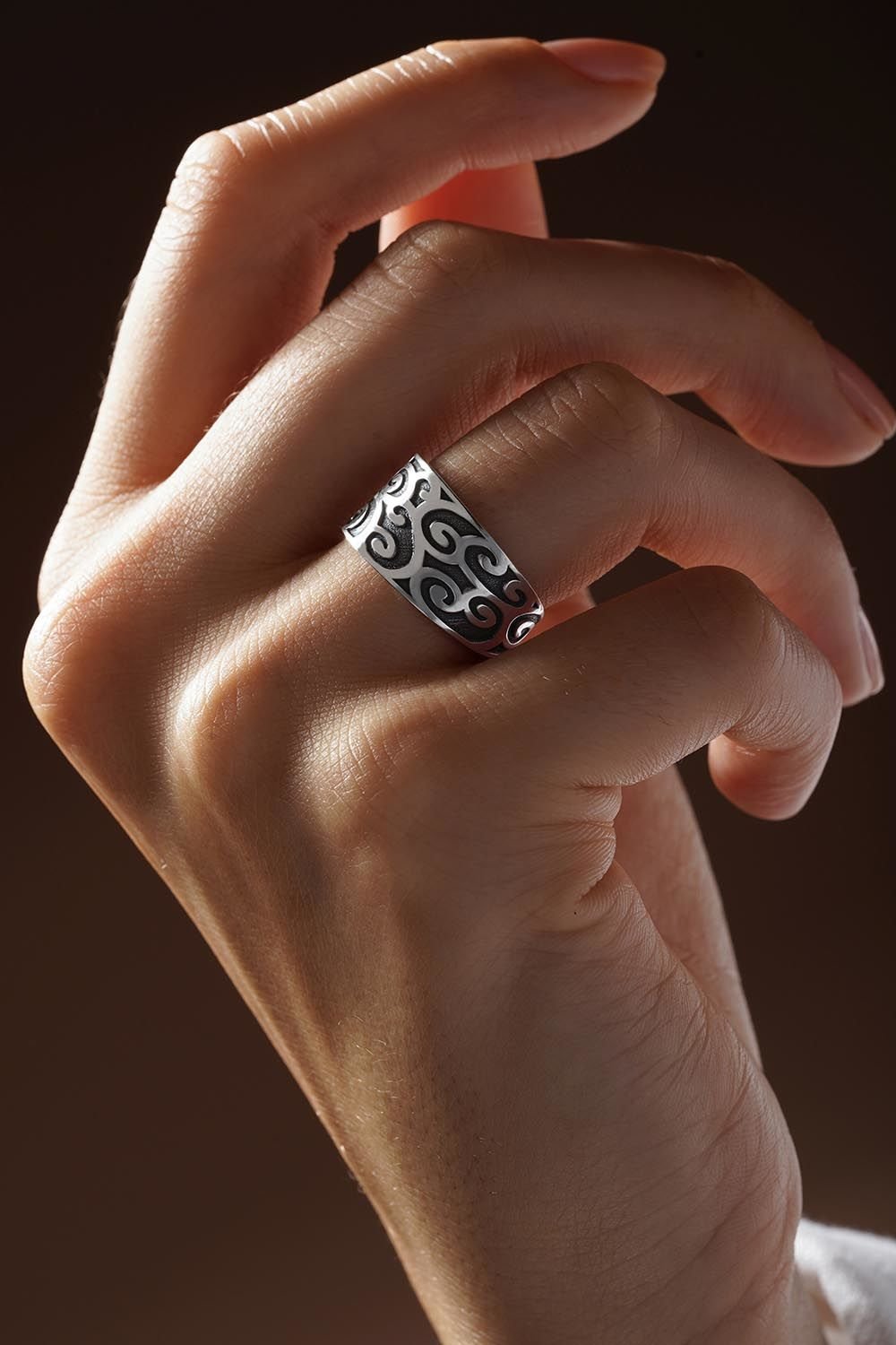 Tasarımında hareket ve süreklilik barındıran Sarmal Desenli Gümüş Yüzük, klasik takı anlayışına modern ve sanatsal bir yorum getiriyor. 925 ayar gümüşün kalitesini, parmağınızı zarifçe saran akışkan hatlarla birleştiren bu model, hem iddialı hem de asil bir duruş sergiliyor.