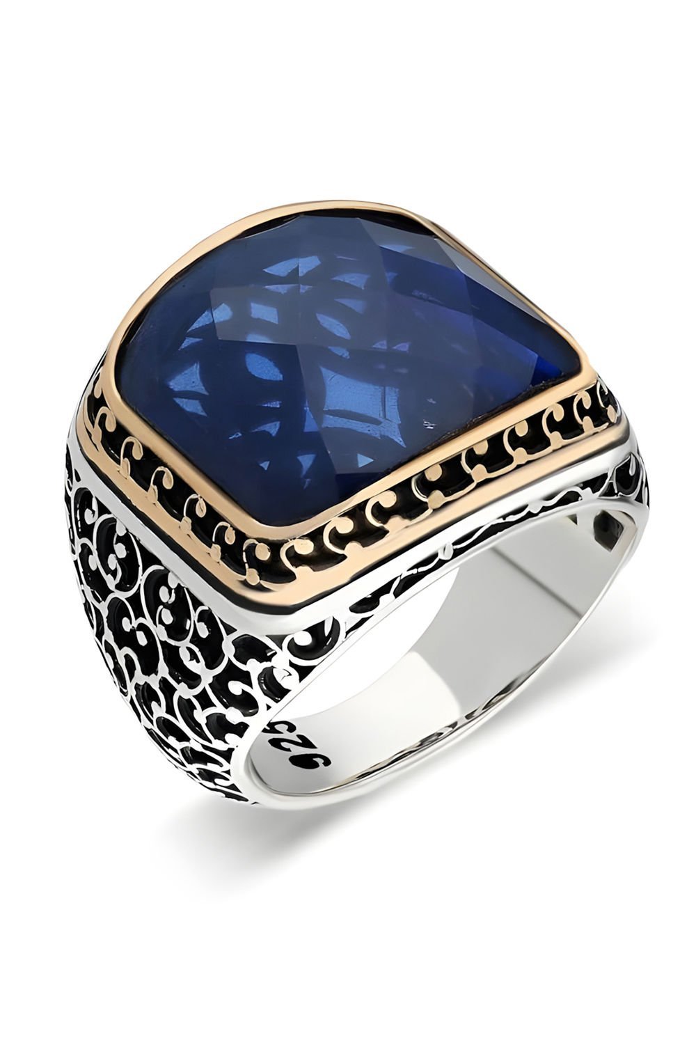 Bu özel erkek yüzüğü, göz alıcı mavi zirkon taşı ve 925 ayar gümüş ile ustaca işlenmiştir. El işçiliği ve özel tasarımıyla benzersiz bir parçadır.