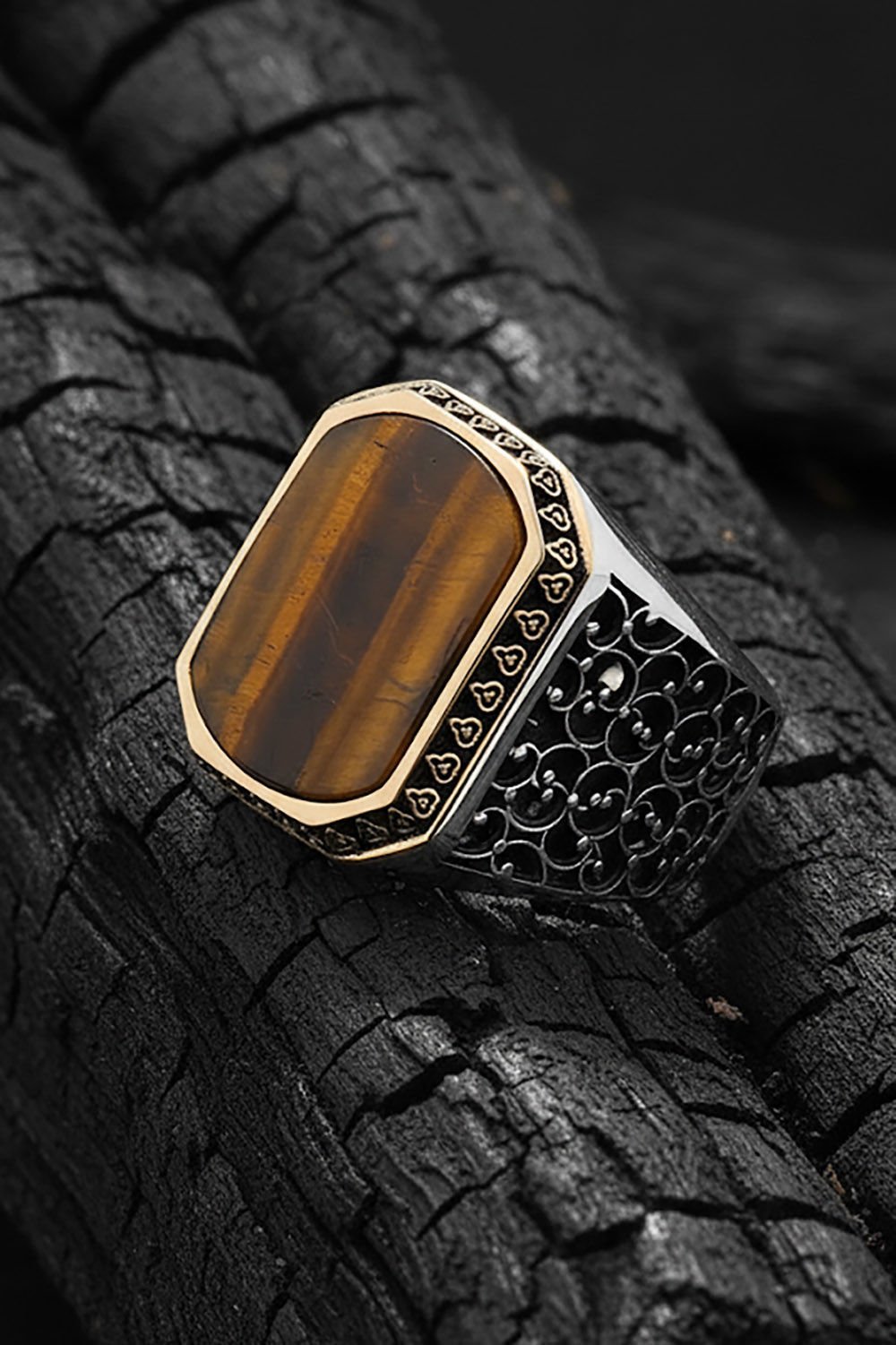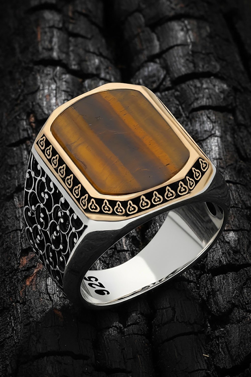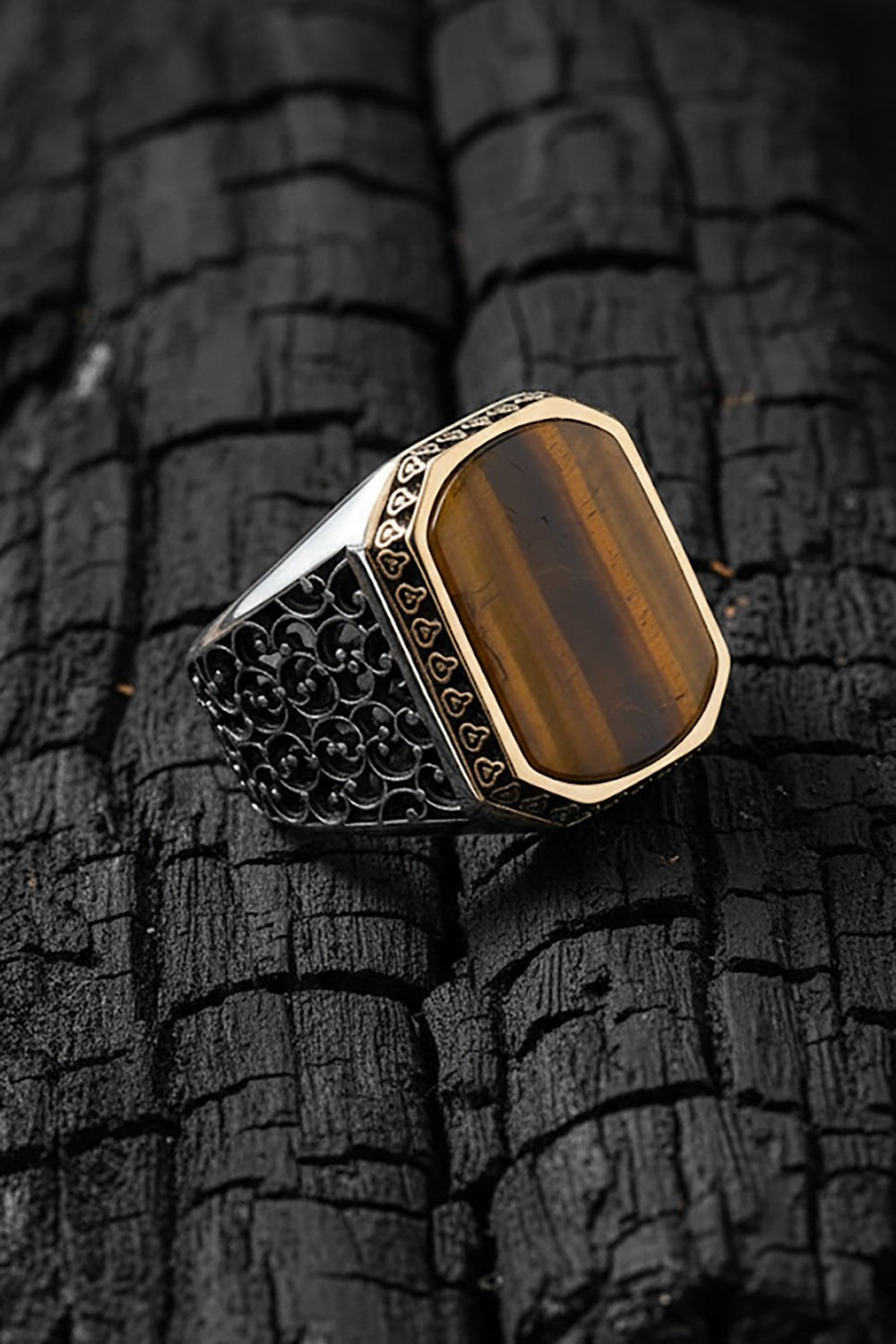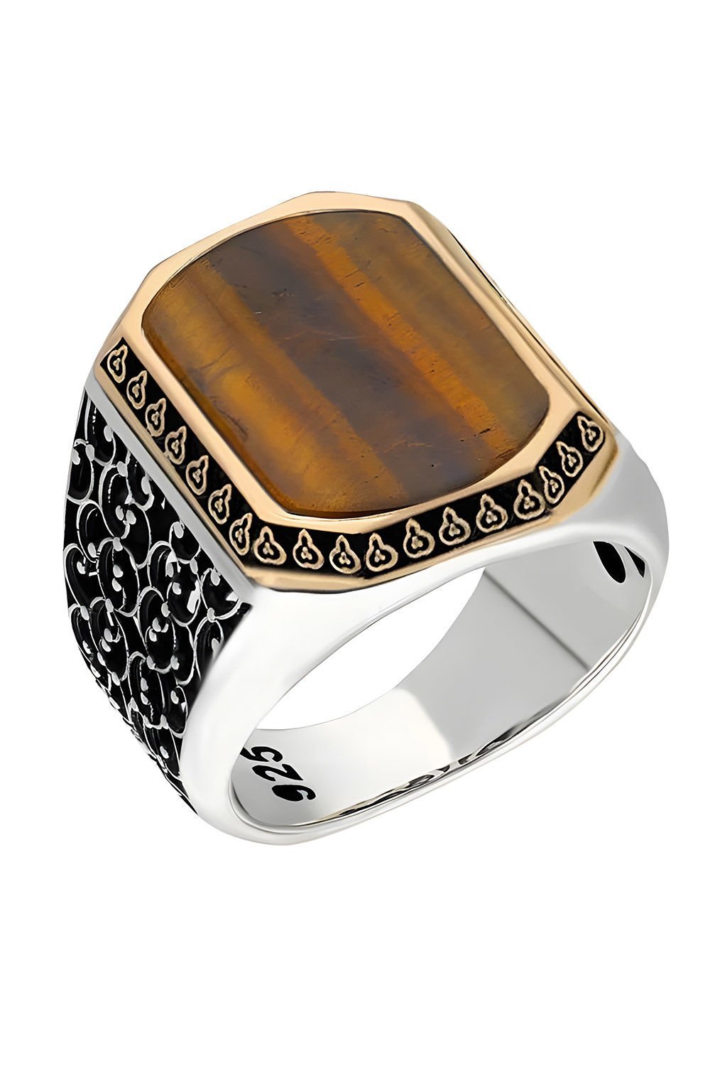 Bu özel erkek yüzüğü, doğal kaplangözü taşı ve 925 ayar gümüş ile özenle tasarlanmıştır. Sadece el işçiliği ile değil aynı zamanda sarmaşık modeli ile de dikkat çekici bir parçadır.