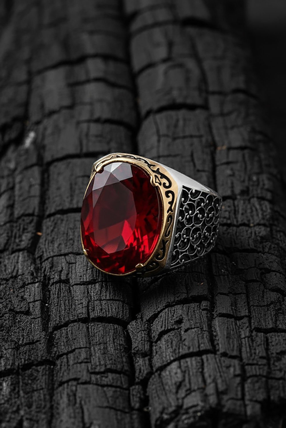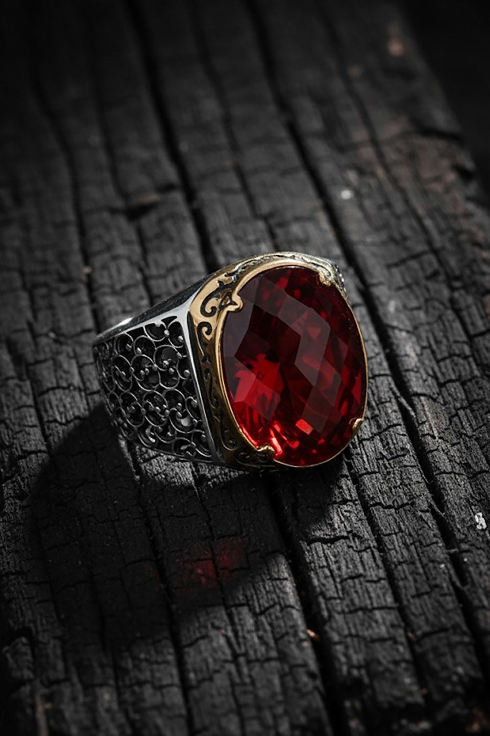 Bu özel erkek yüzüğü, doğal kırmızı zirkon taşı ve 925 ayar gümüş ile özenle tasarlanmıştır. Sarmaşık modeli ve özel işçilik detaylarıyla dikkat çeker.