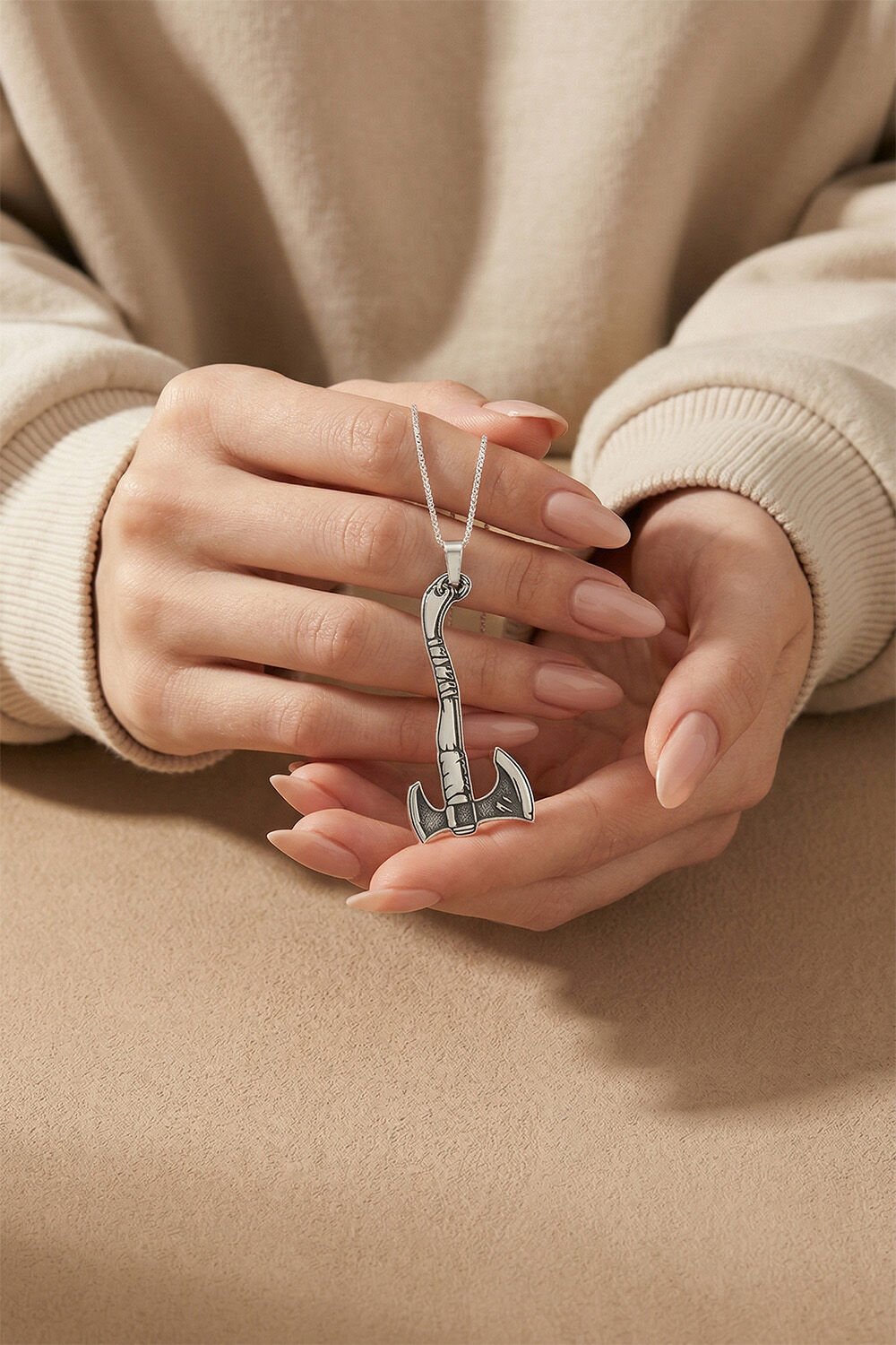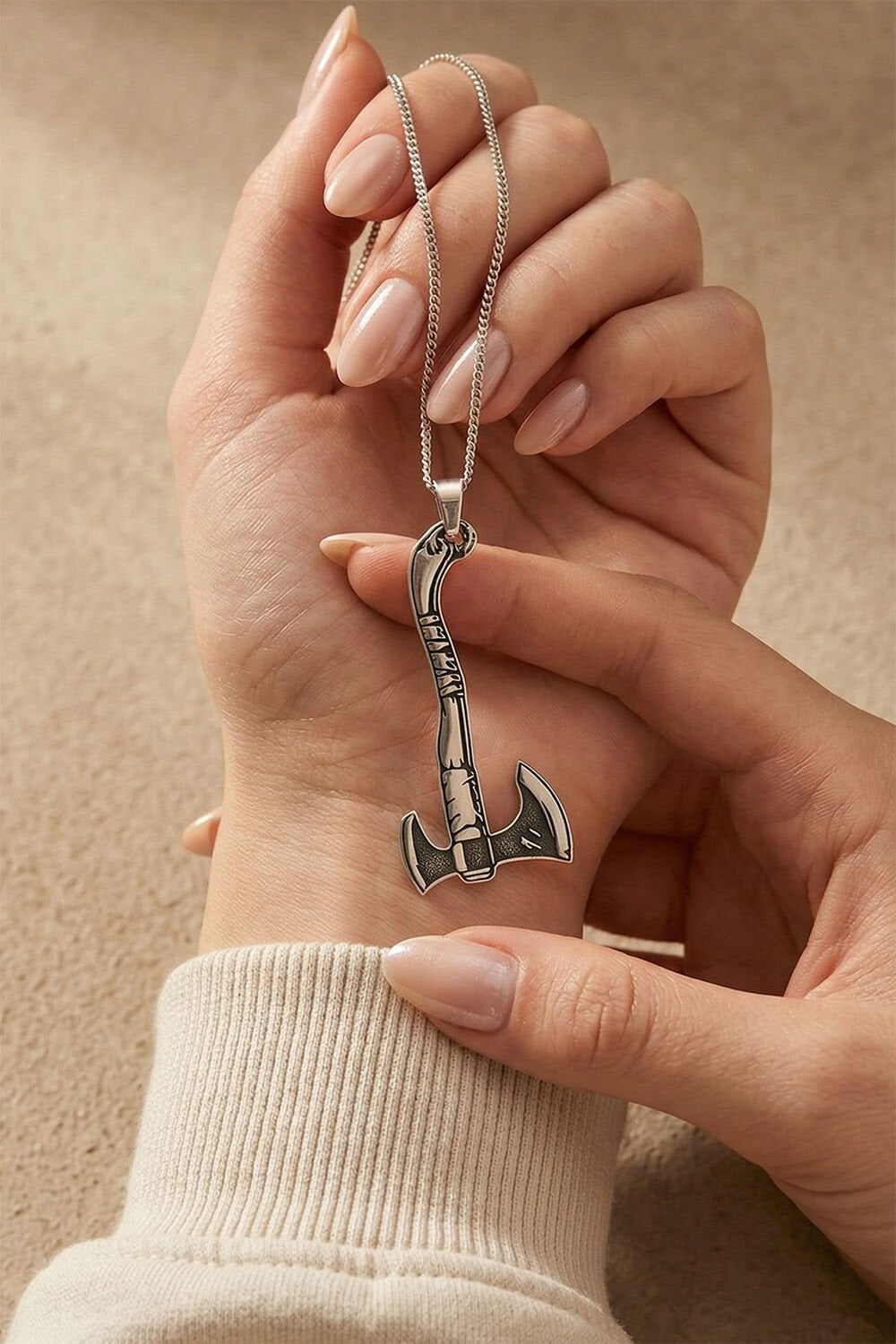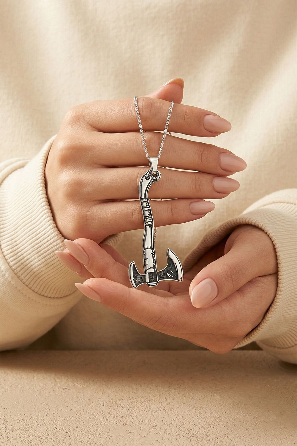 Neden Bu Kolyeyi Tercih Etmelisiniz? Bu özel tasarım kolye, sadece bir aksesuar değil, aynı zamanda kararlılığın ve dayanıklılığın bir simgesidir. 925 ayar gerçek gümüşten üretilen kolye ucu, çift taraflı balta (labrys) formunun estetik detaylarını en ince ayrıntısına kadar sunar. 55 cm uzunluğundaki sağlam gümüş zinciri ile ideal bir kullanım konforu sağlar.