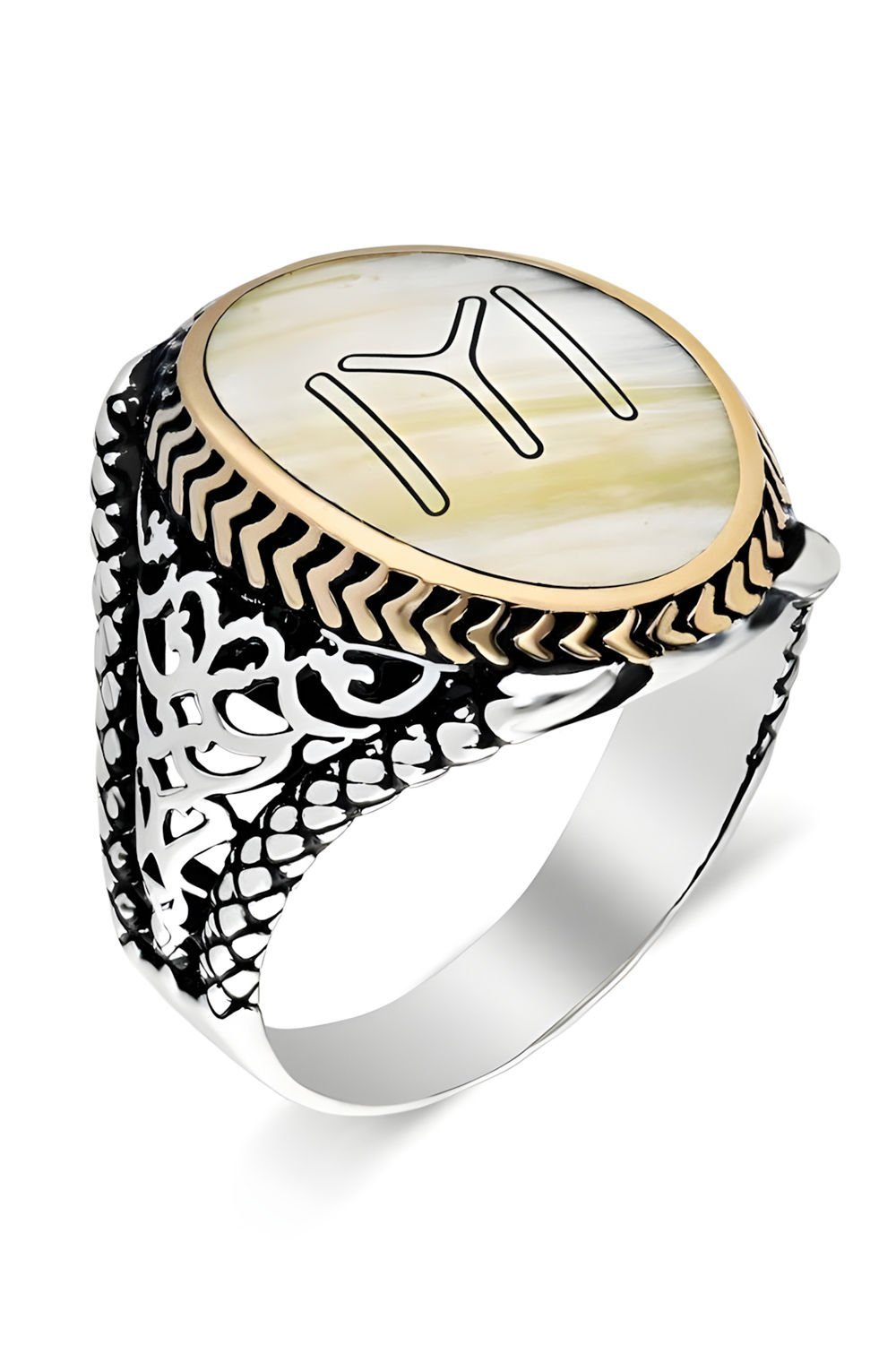 Bu özel erkek yüzüğü, doğal sedef taşı ve 925 ayar gümüş ile ustaca işlenmiştir. Kayı boyu arması deseni ve özel işçiliği ile dikkat çeker.