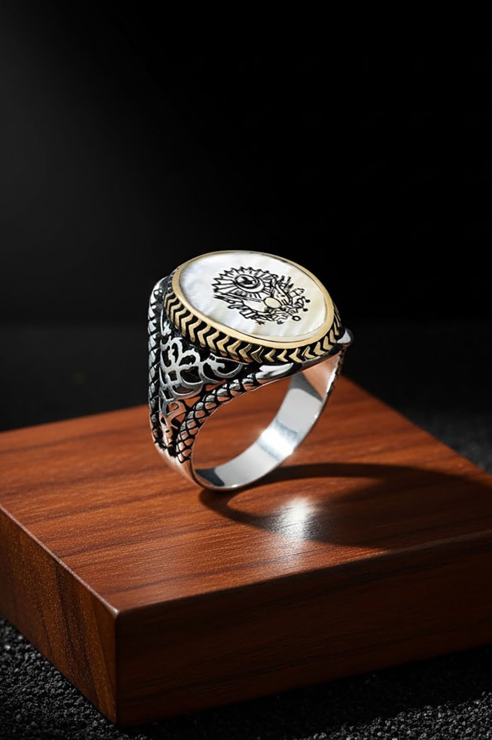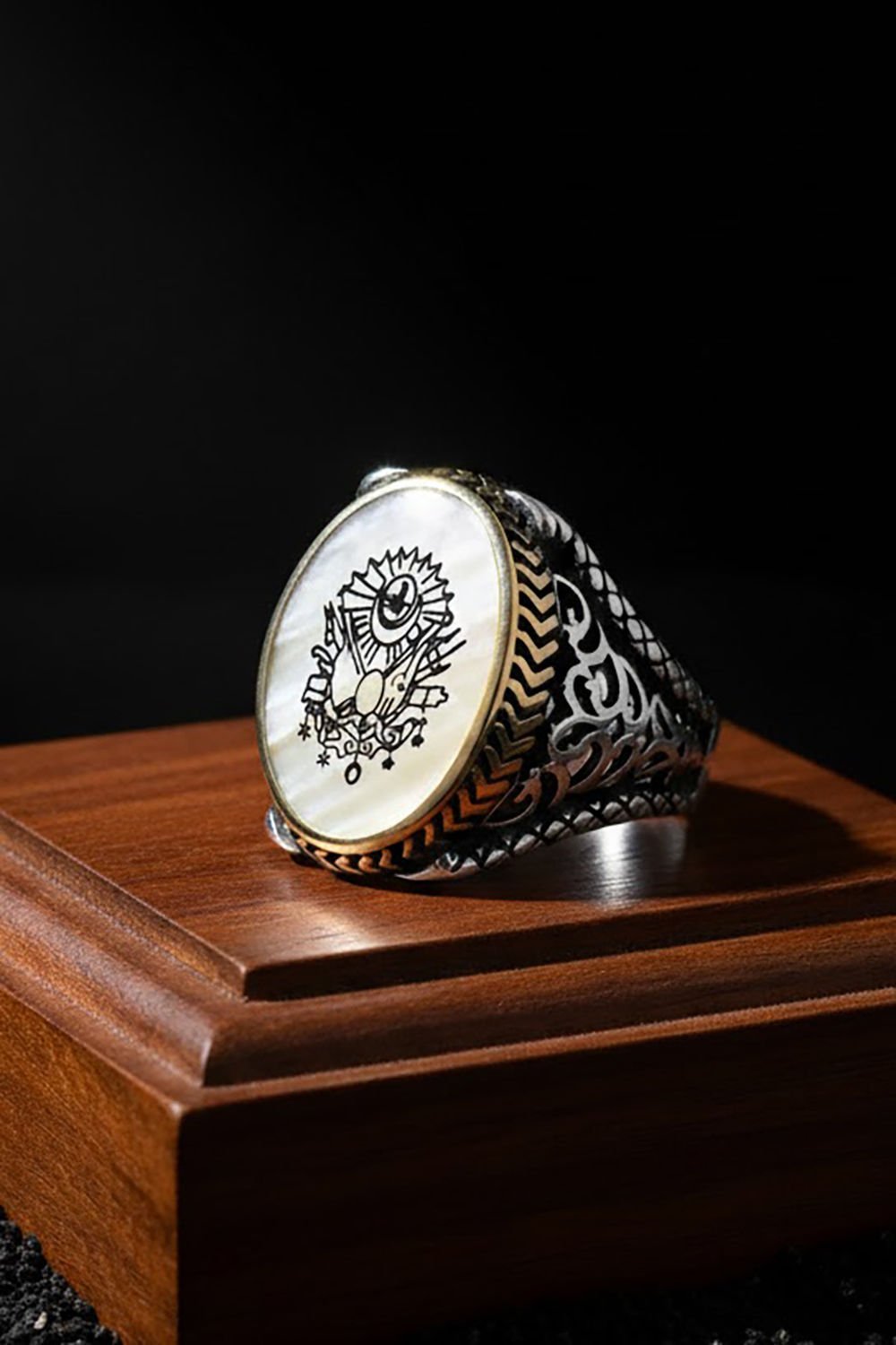 Bu özel erkek yüzüğü, doğal sedef taşı ve 925 ayar gümüş ile ustaca işlenmiştir. Üzerinde Osmanlı Devleti arması deseni bulunmaktadır, özel işçiliği ile dikkat çeker.