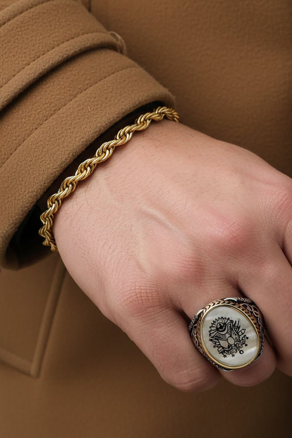Bu yüzük, deneyimli zanaatkarlar tarafından elde işlenmiş ve her bir detayı özenle işlenmiştir. Osmanlı Devleti arması deseni ve özel tasarımıyla şıklığı ön plana çıkarır.