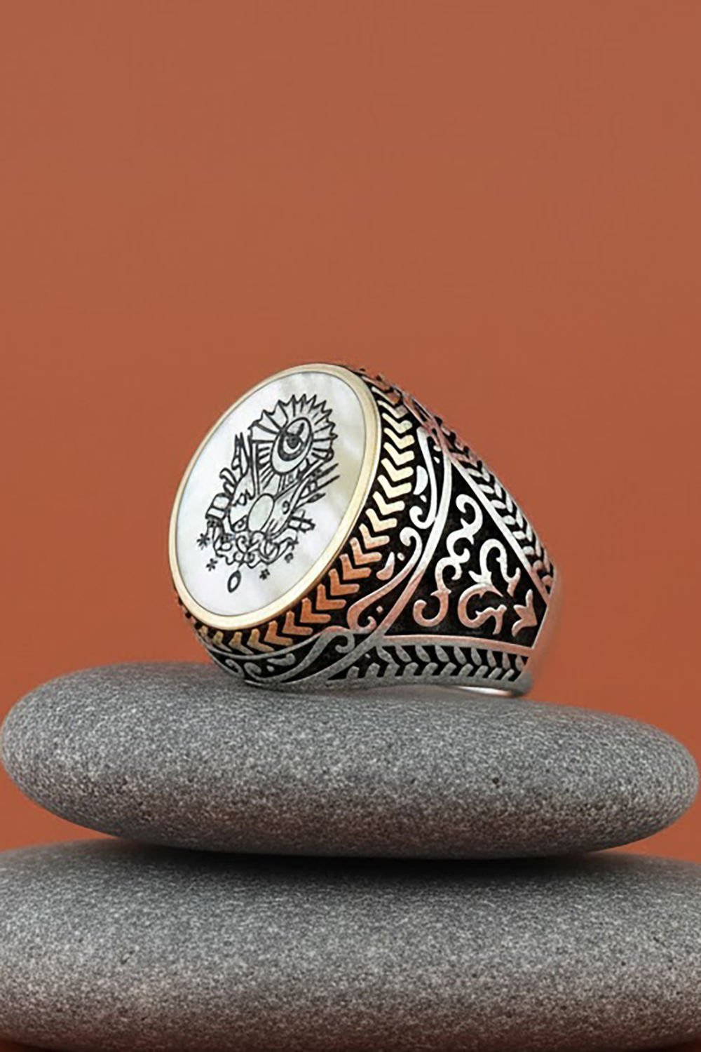 Bu özel erkek yüzüğü, doğal sedef taşı ve 925 ayar gümüş ile elde işlenmiştir. Her bir detayı özenle işlenmiş olan bu yüzük, şıklığı ve zarafeti bir araya getirir.