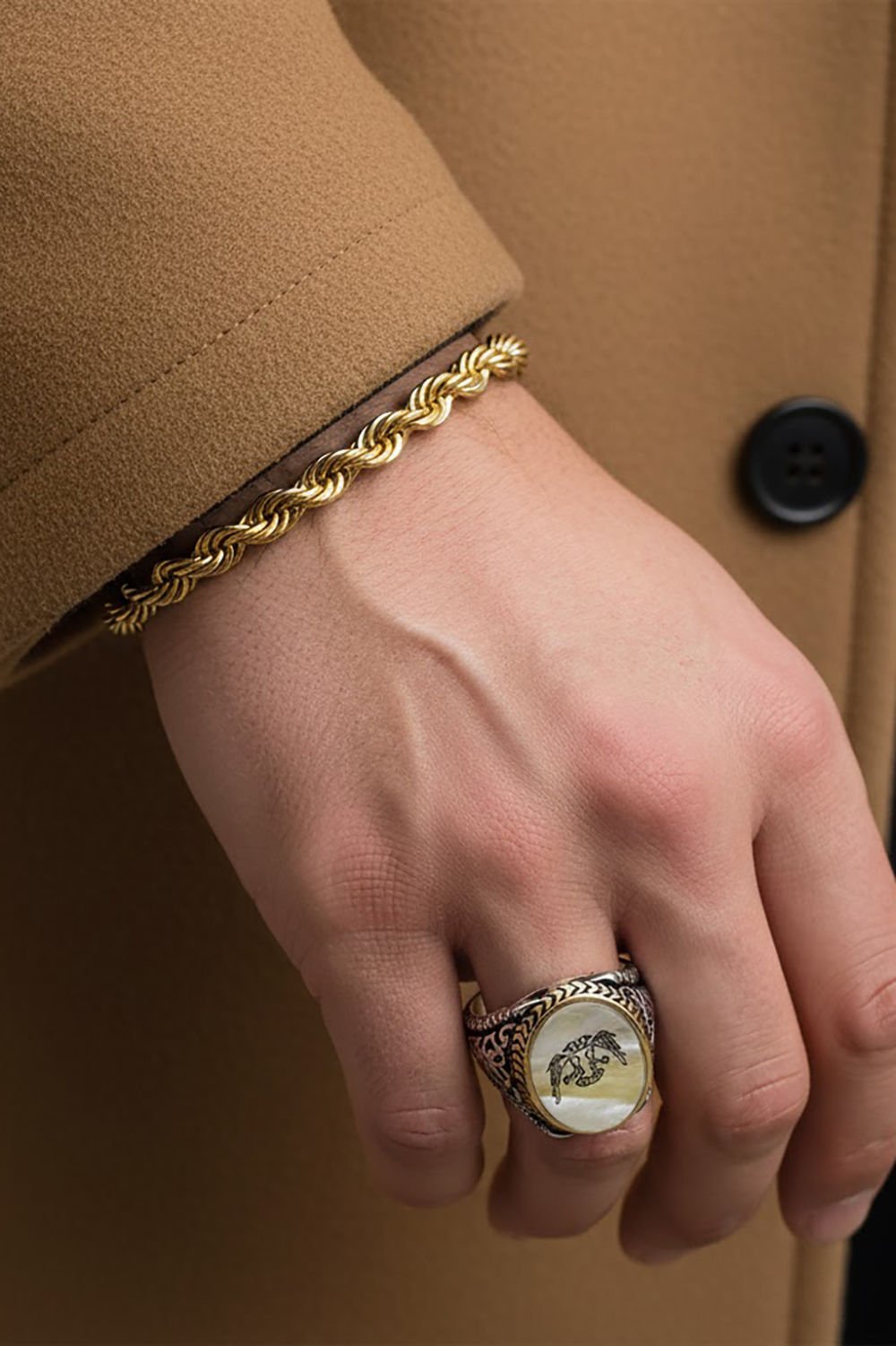 Bu özel erkek yüzüğü, doğal sedef taşı ve 925 ayar gümüş ile ustaca işlenmiştir. Üzerinde Selçuklu kartalı deseni bulunmaktadır, özel işçiliği ile dikkat çeker.