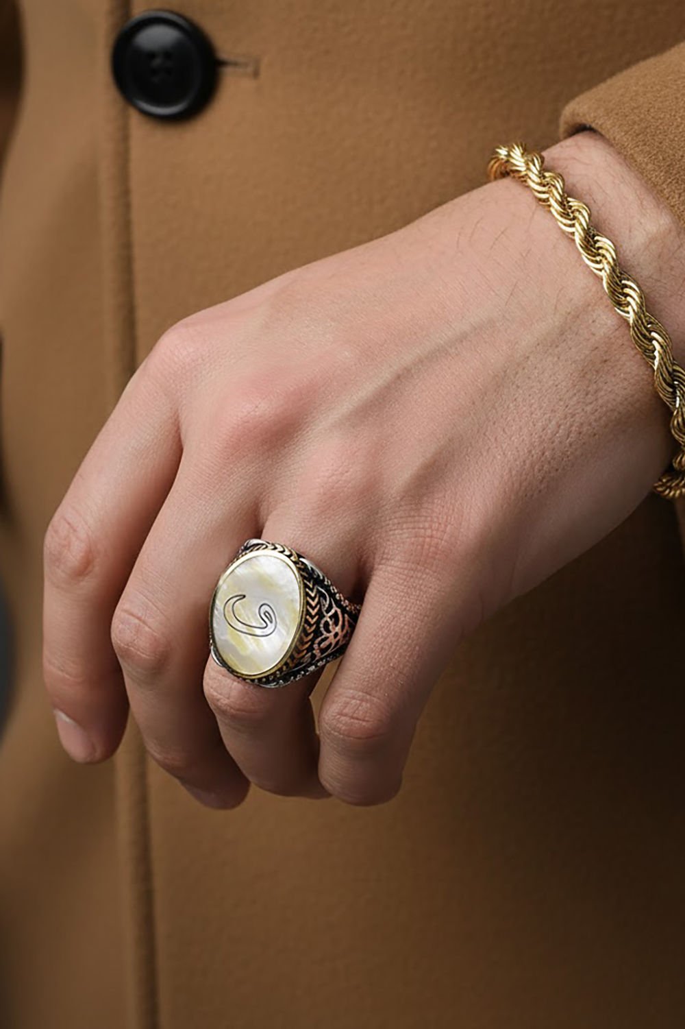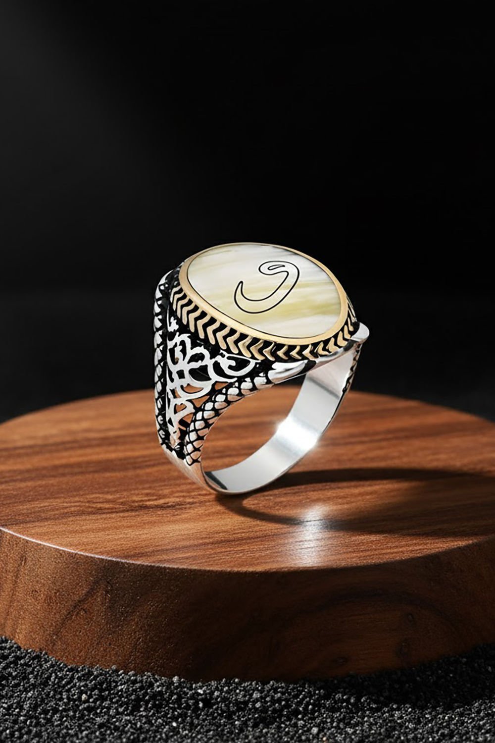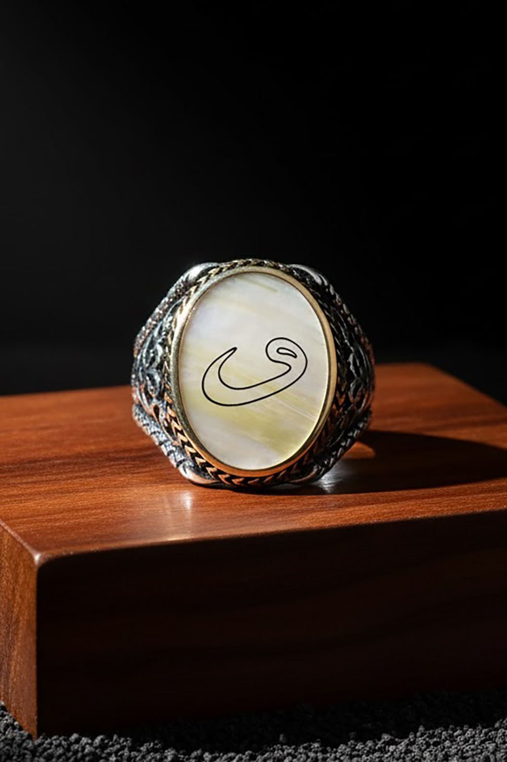 Bu özel erkek yüzüğü, doğal sedef taşı ve 925 ayar gümüş ile ustaca işlenmiştir. Üzerinde Vav harfi deseni bulunmaktadır, özel işçiliği ile dikkat çeker.