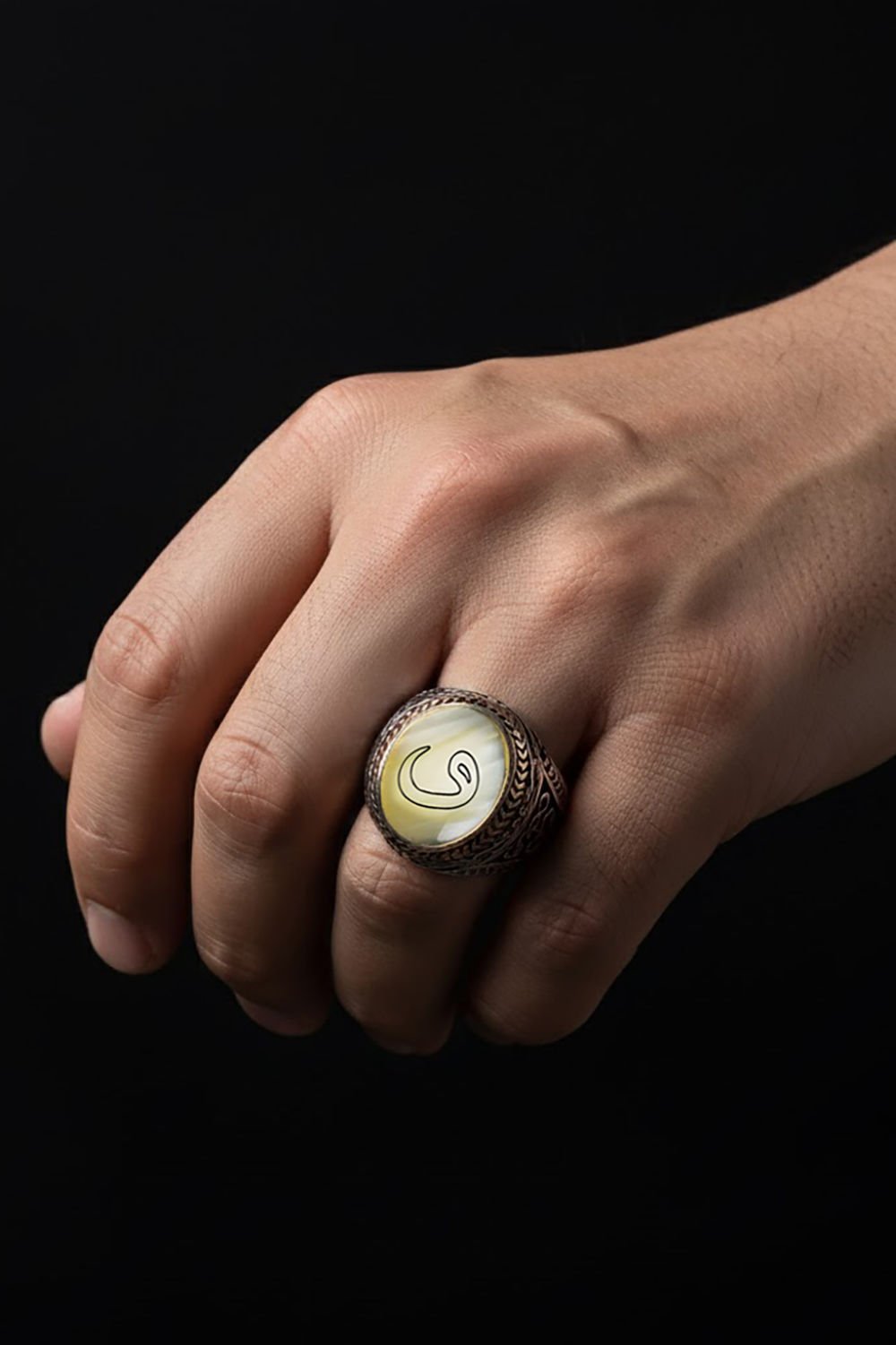 Bu özel erkek yüzüğü, doğal sedef taşı ve 925 ayar gümüş ile ustaca işlenmiştir. Her detayı özenle şekillendirilmiş olan bu yüzük, estetik ve zarafeti bir araya getirir.