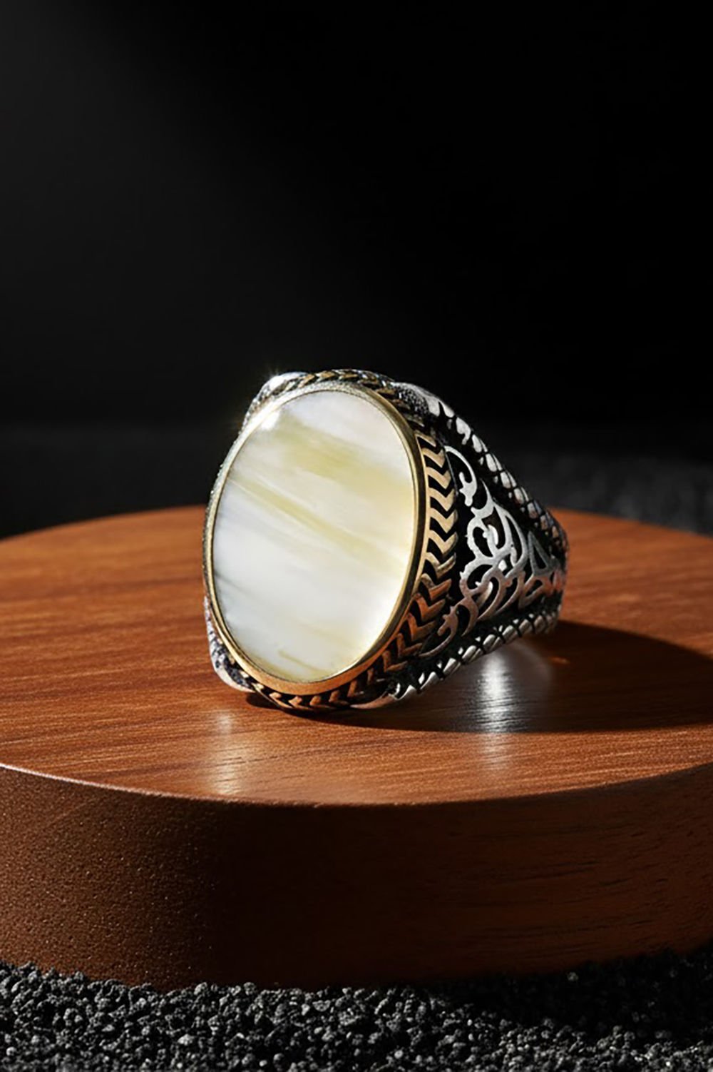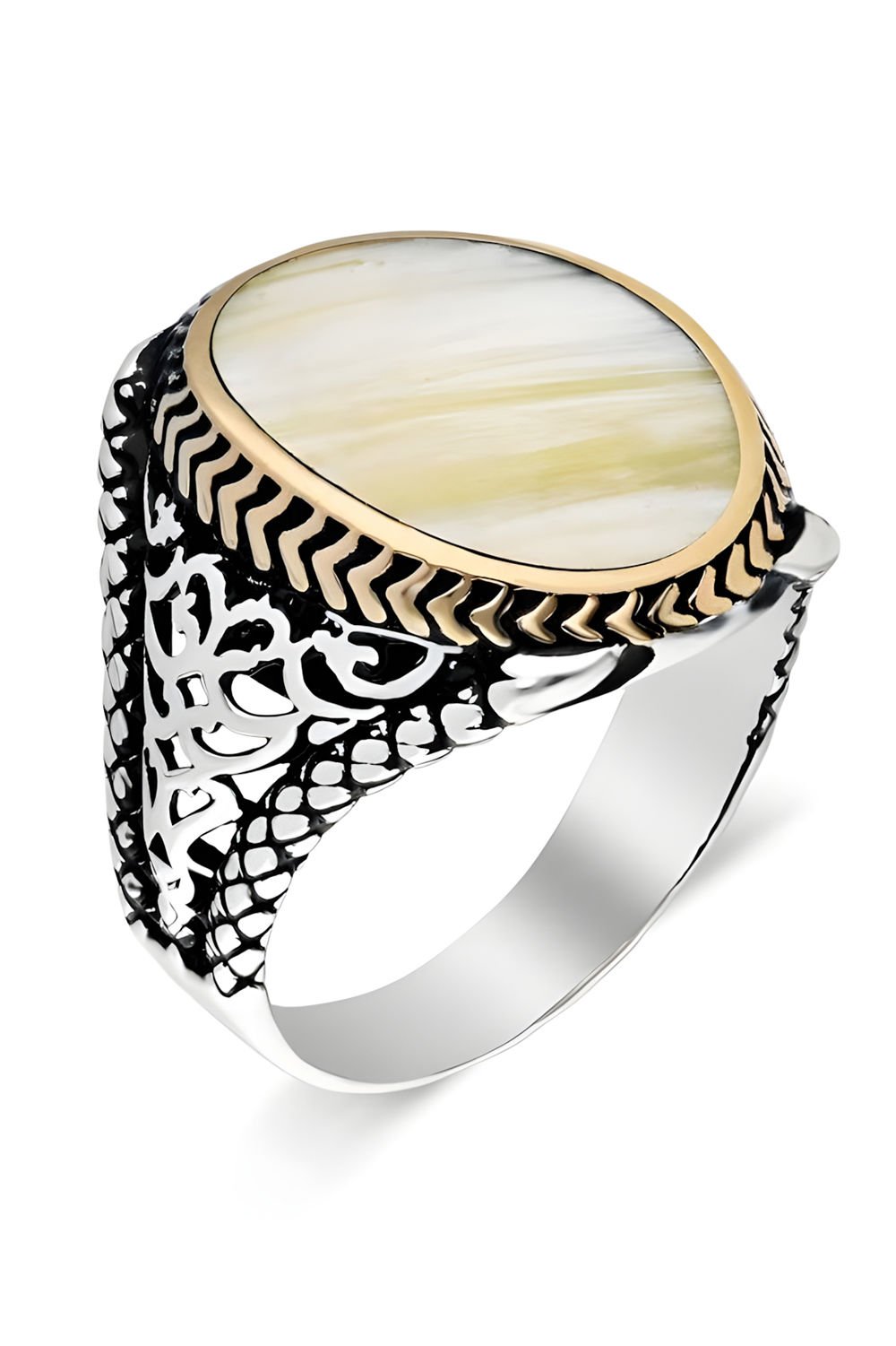 Bu özel erkek yüzüğü, doğal sedef taşı ve 925 ayar gümüş ile ustaca işlenmiştir. Sade tasarımı ile dikkat çeker ve zarifliği ön plana çıkarır.