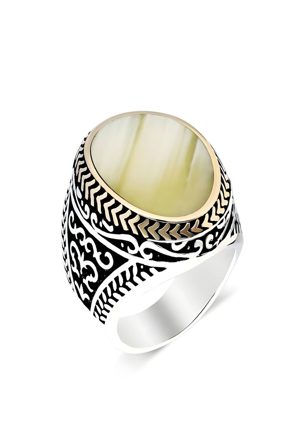 Bu özel erkek yüzüğü, doğal sedef taşı ve 925 ayar gümüş ile ustaca işlenmiştir. Her detayı özenle şekillendirilmiş olan bu yüzük, estetik ve zarafeti bir araya getirir.