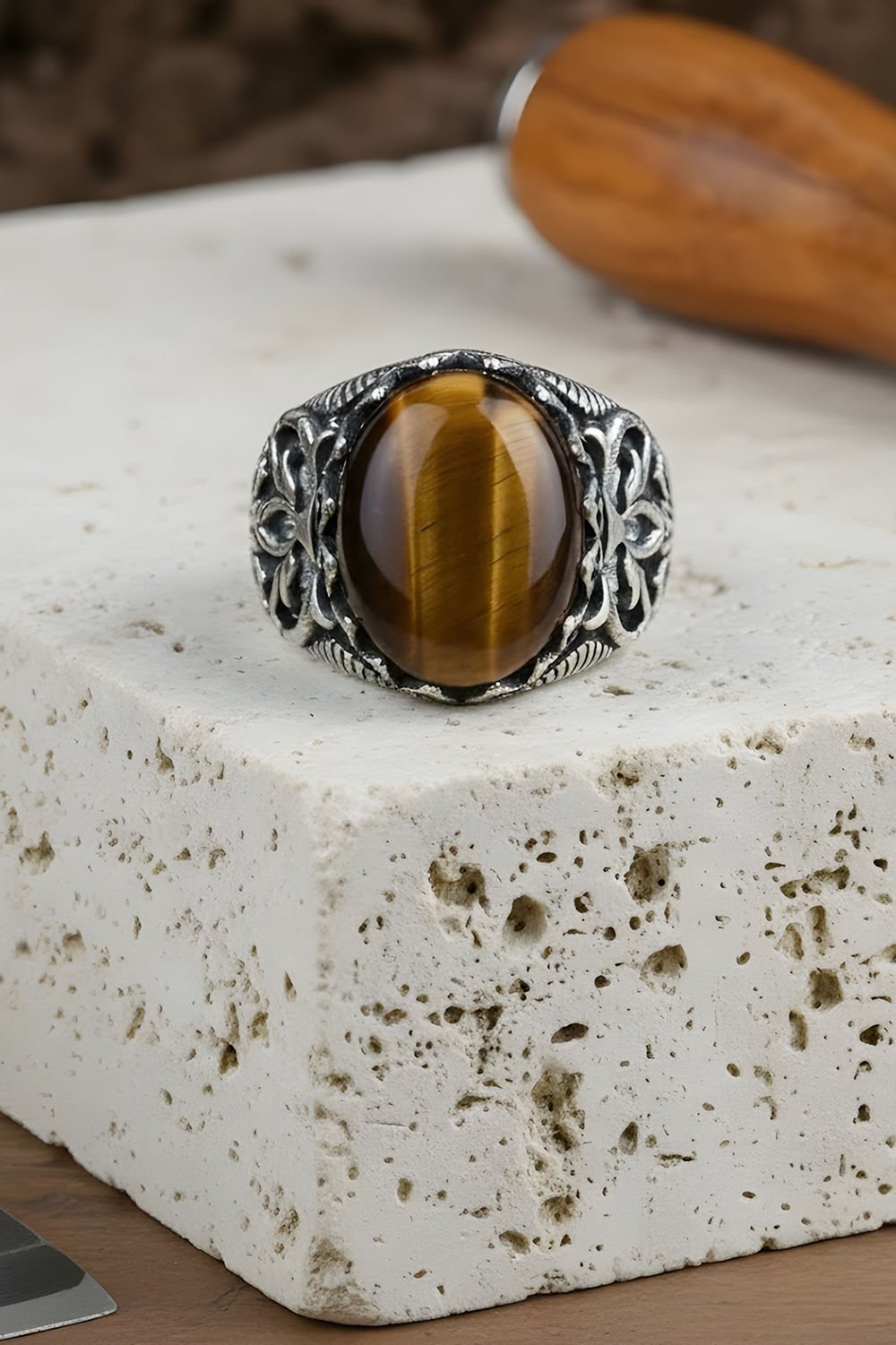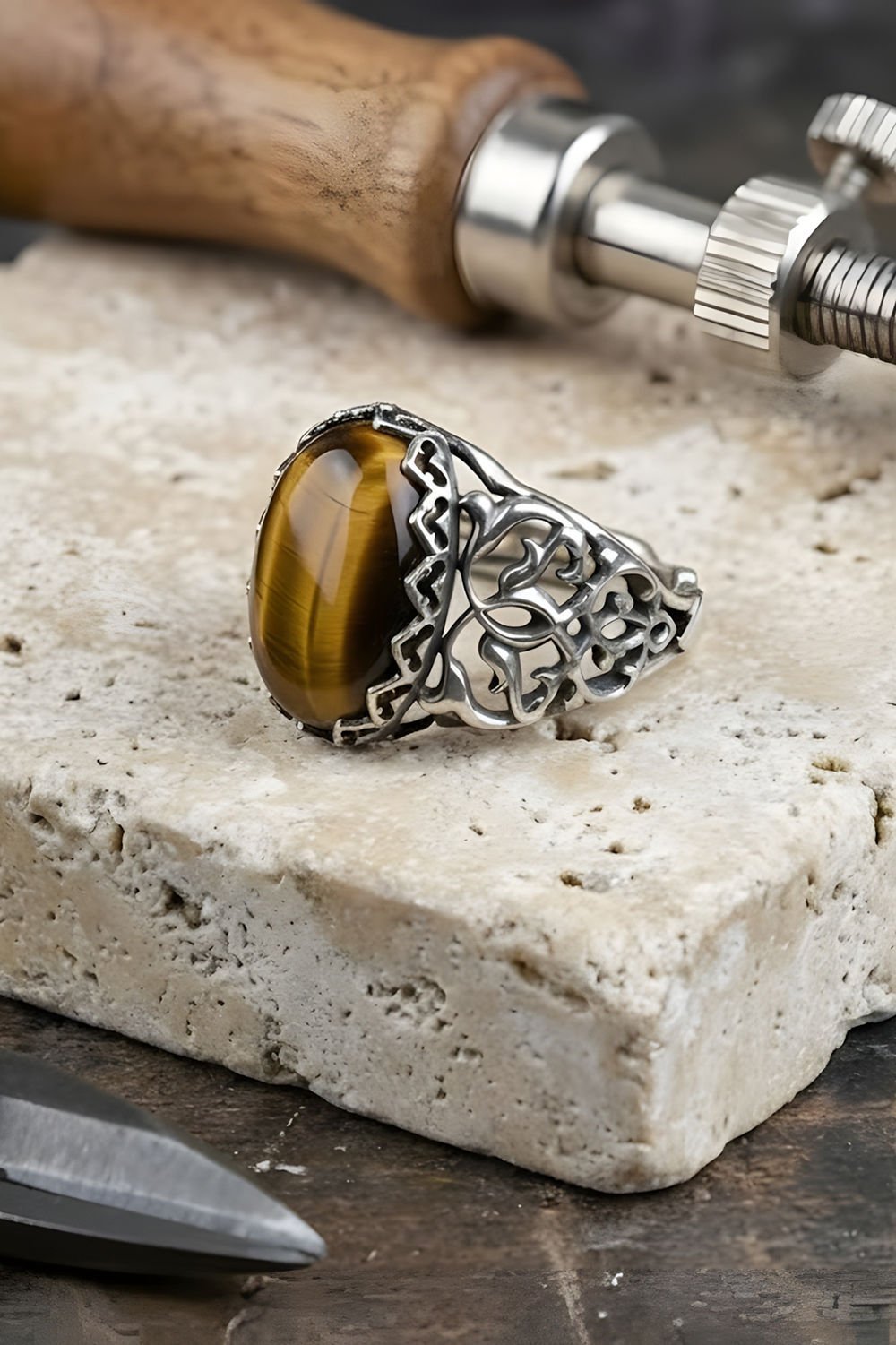 Selçuklu Motifli El İşi Kaplangözü Taşlı Gümüş Yüzük |