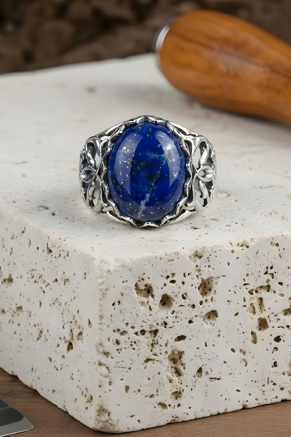 Selçuklu Motifli El İşi Lapis Lazuli Taşlı Gümüş Yüzük |
