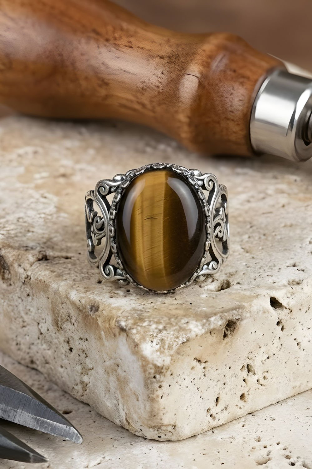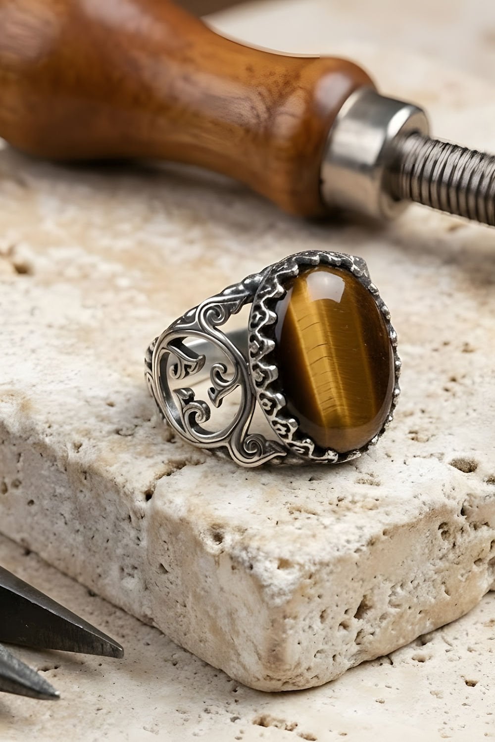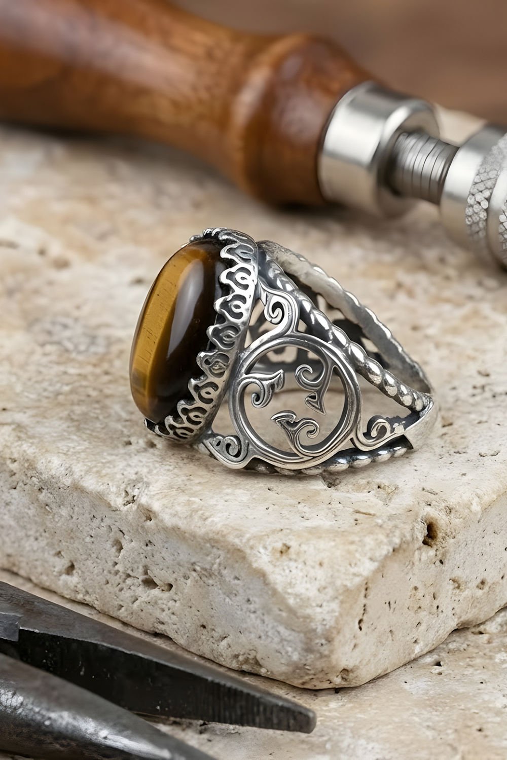 Selçuklu’nun tarih kokan motifleri, doğanın en dinamik taşıyla buluşuyor! Selçuklu Sarmaşığı Model El İşi Kaplangözü Taşlı Gümüş Yüzük, ışıkla dans eden kahverengi ve altın sarısı hareleriyle parmağınızda büyüleyici bir şıklık sunuyor. Tamamen el işçiliği ile üretilen bu tasarım, gücü ve estetiği bir arada arayanlar için özel olarak hazırlandı.