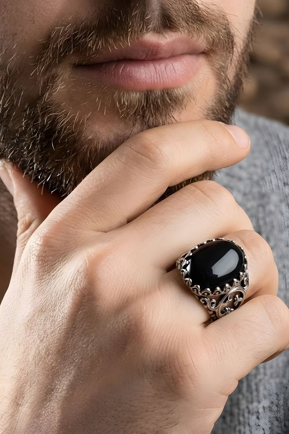 Geçmişin estetiği, siyahın zamansız gücüyle buluşuyor. Selçuklu Sarmaşığı Model El İşi Oniks Taşlı Gümüş Yüzük, Selçuklu sanatının karakteristik sarmaşık motiflerini, asaletin simgesi olan doğal oniks taşıyla bir araya getiriyor. Tamamen el işçiliği ile üretilen bu özel tasarım, karakterini tarzına yansıtmak isteyen erkekler için tasarlandı.