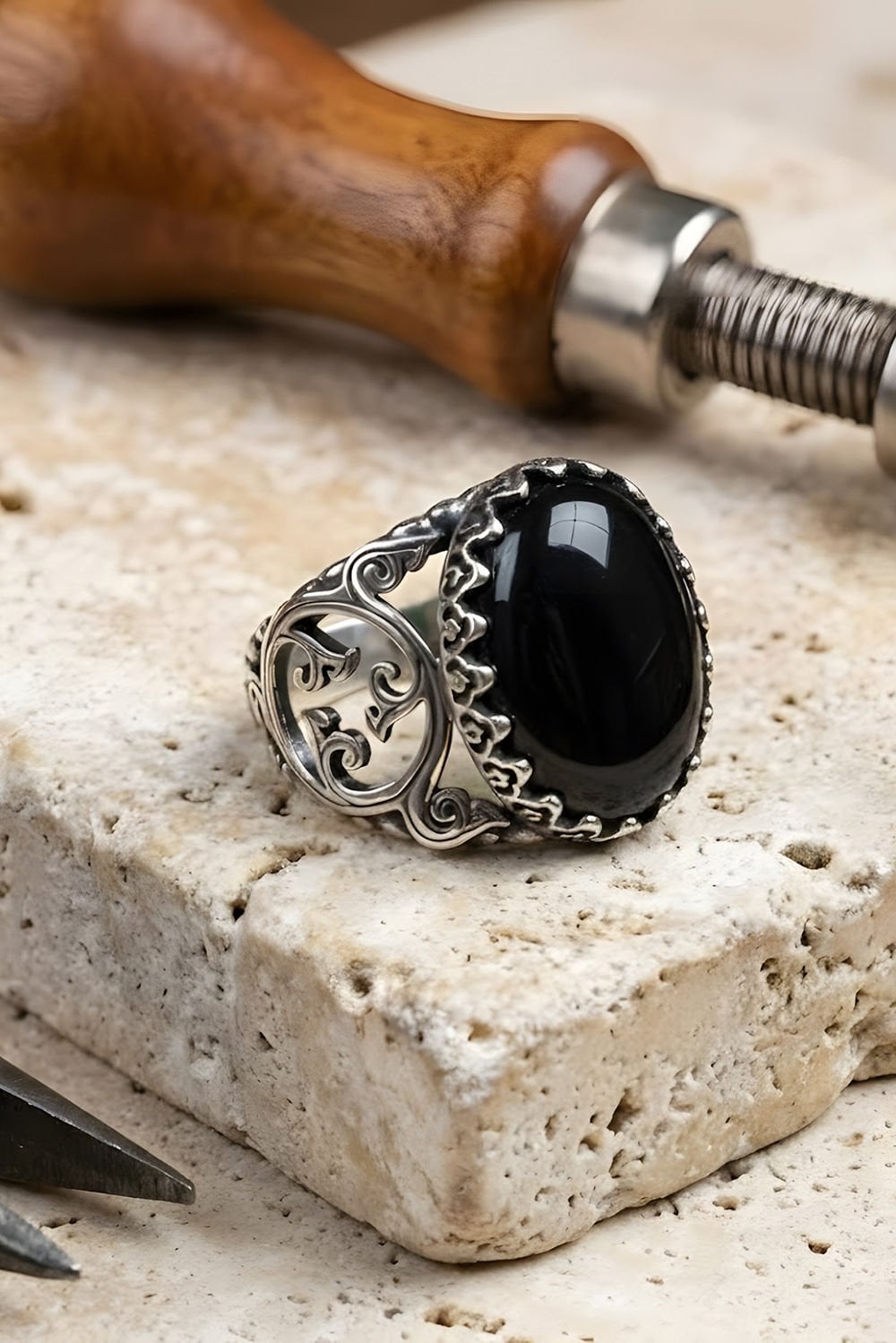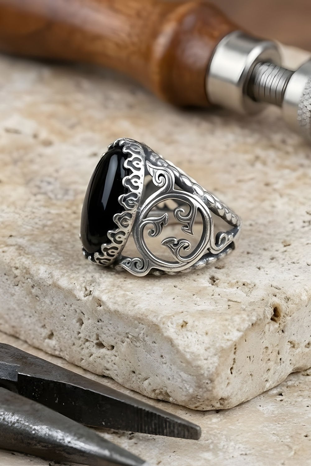 Oniks taşı, stresle başa çıkmaya yardımcı olan ve odaklanmayı artıran bir doğal taş olarak bilinir. Selçuklu mimarisindeki sonsuzluk ve bağlılık sembolü olan sarmaşık desenleri, siyah oniks taşının vakur duruşuyla birleştiğinde ortaya sadece bir aksesuar değil, güçlü bir imaj çıkıyor. 18 gramı aşan gümüş kütlesi, yüzüğün parmağınızdaki varlığını ve kalitesini her an hissettirir.