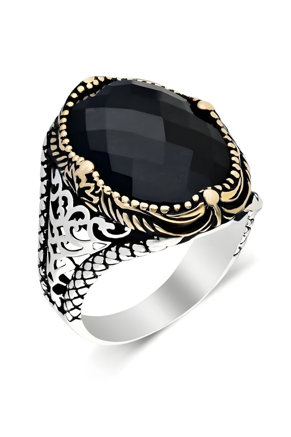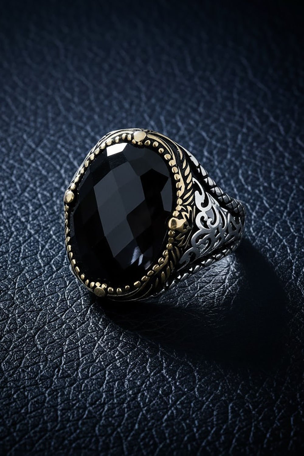 Yüzüğün merkezindeki doğal siyah zirkon taşı, gücü ve zarafeti temsil eder. 925 ayar gümüşle birleştiğinde ise kaliteli ve etkileyici bir yüzük ortaya çıkar.