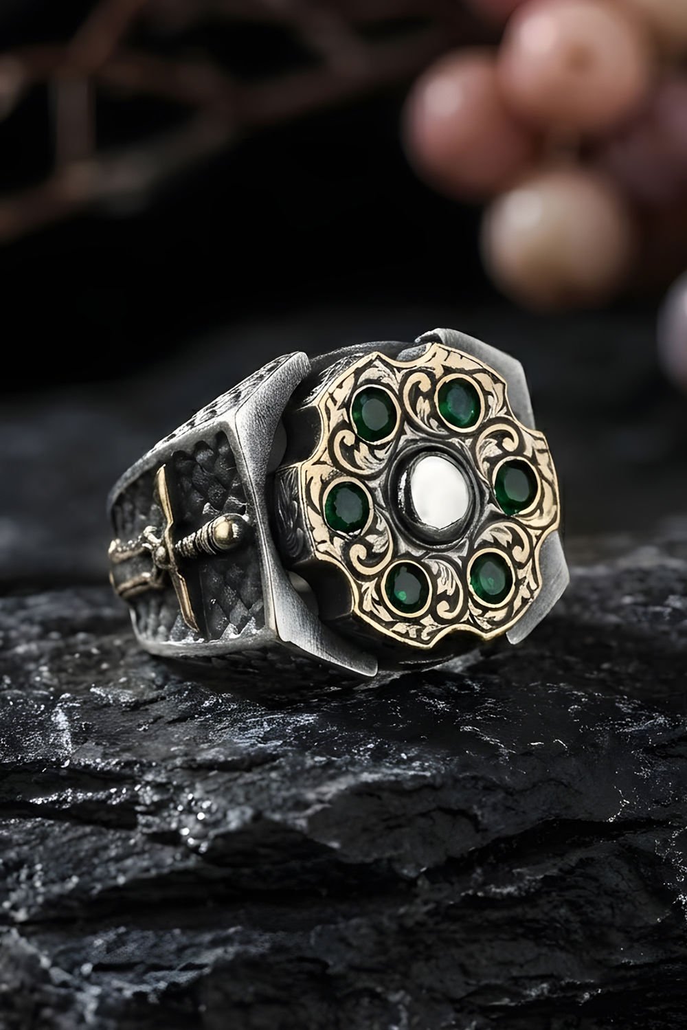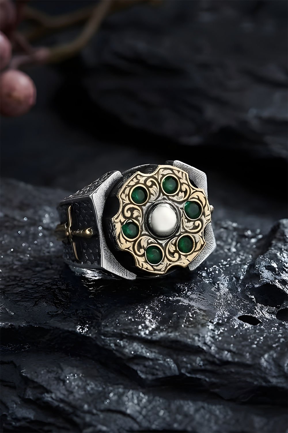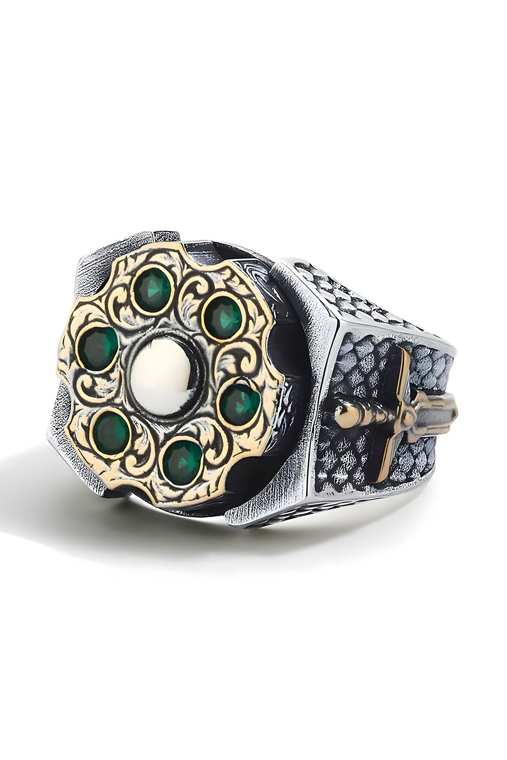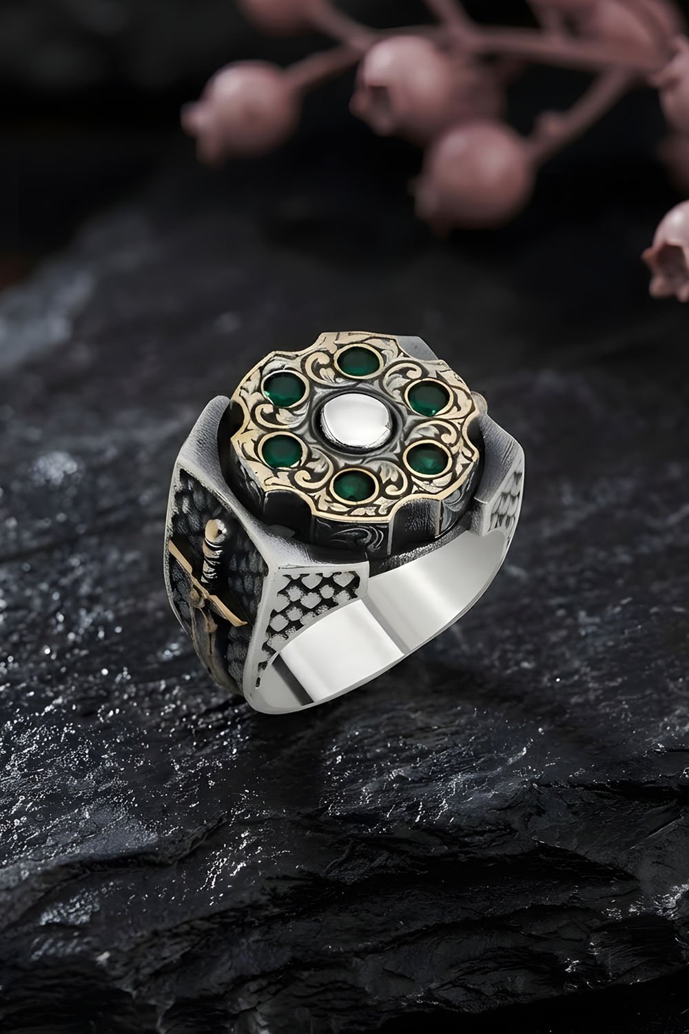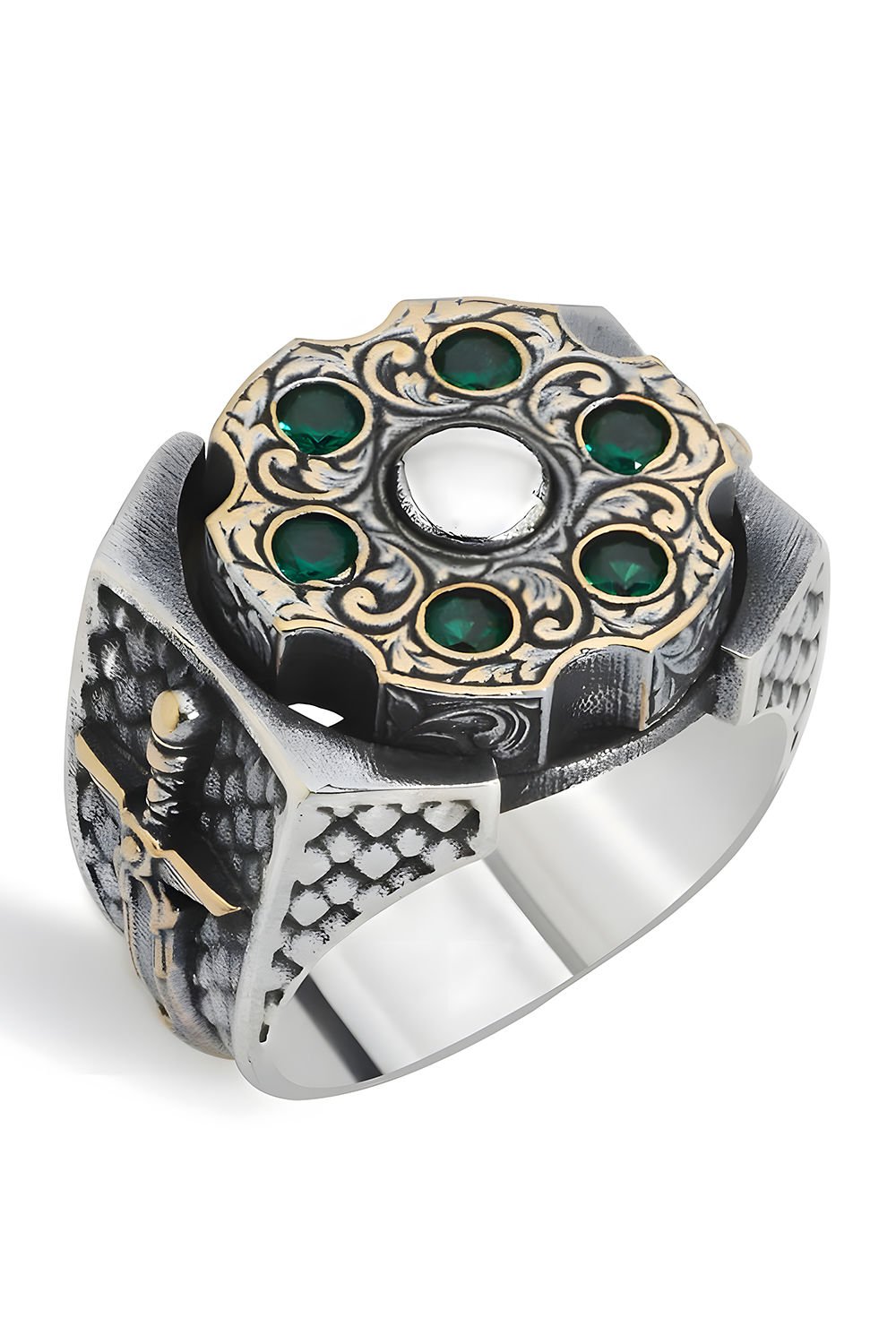 Işıltılı Yeşil Zirkon Taşlar: Doğanın enerjisini yansıtan yüksek kaliteli yeşil zirkon taşlar, gümüşün asil parlaklığı ile harika bir uyum yakalar. Özel mıhlama tekniği ile yerleştirilen taşlar, her dönüşte ışığı yansıtarak stilinize hareket katar.