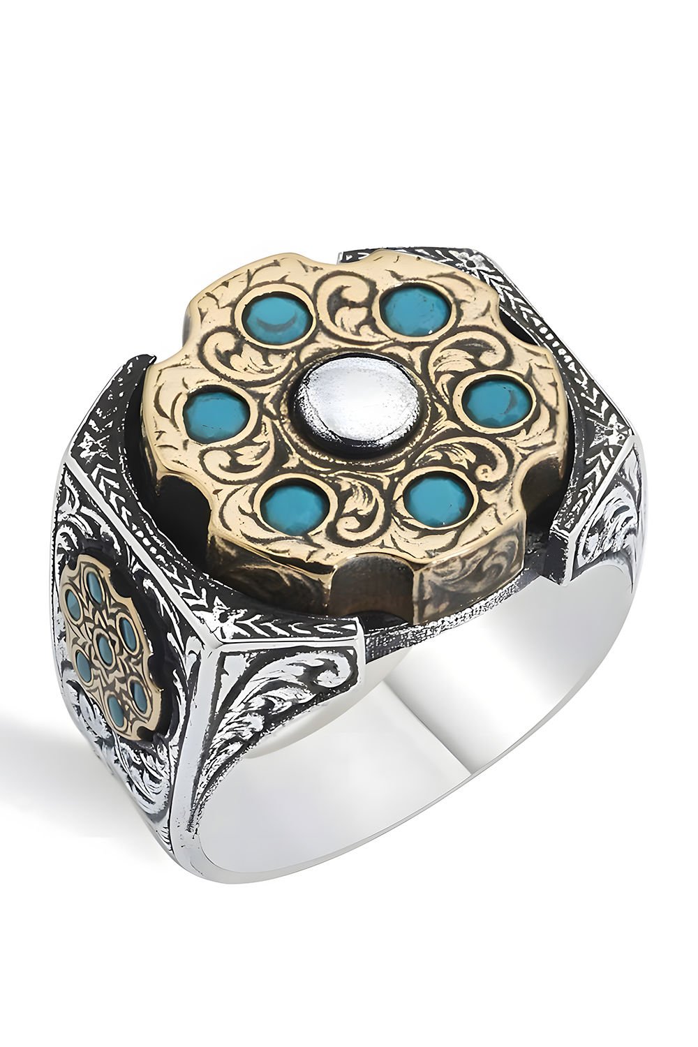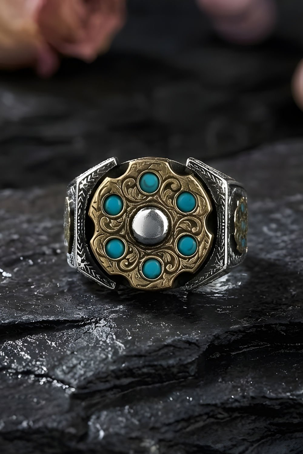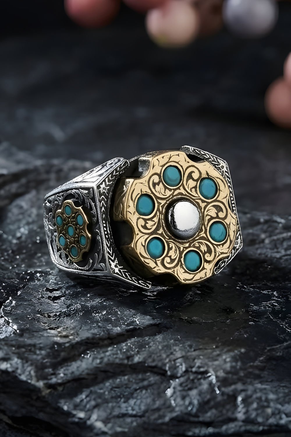 Stres Çarkı Rulet Model Turkuaz Zirkon Taşlı 925 Ayar Gümüş Erkek Yüzük
