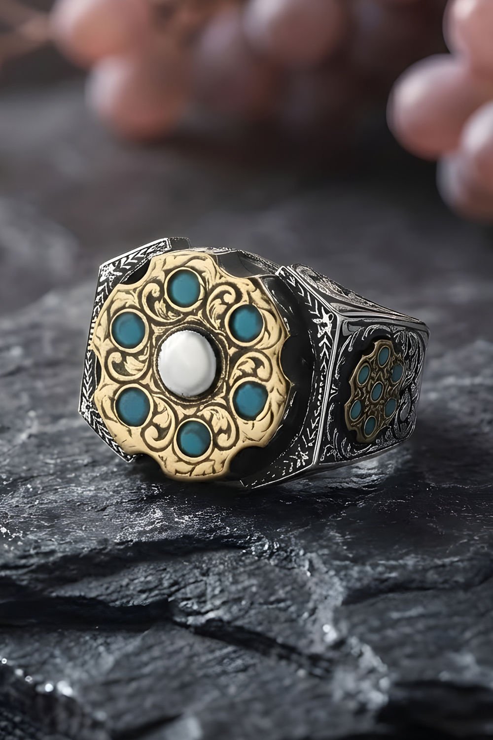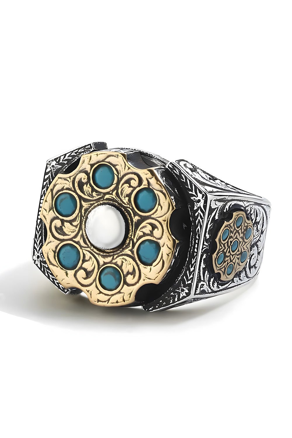 Turkuaz Işıltısı: Canlı turkuaz rengindeki yüksek kaliteli zirkon taşlar, gümüşün asil parlaklığıyla mükemmel bir zıtlık oluşturur. Bu renk seçimi, yüzüğe hem modern bir hava katar hem de enerjinizi yükseltir.