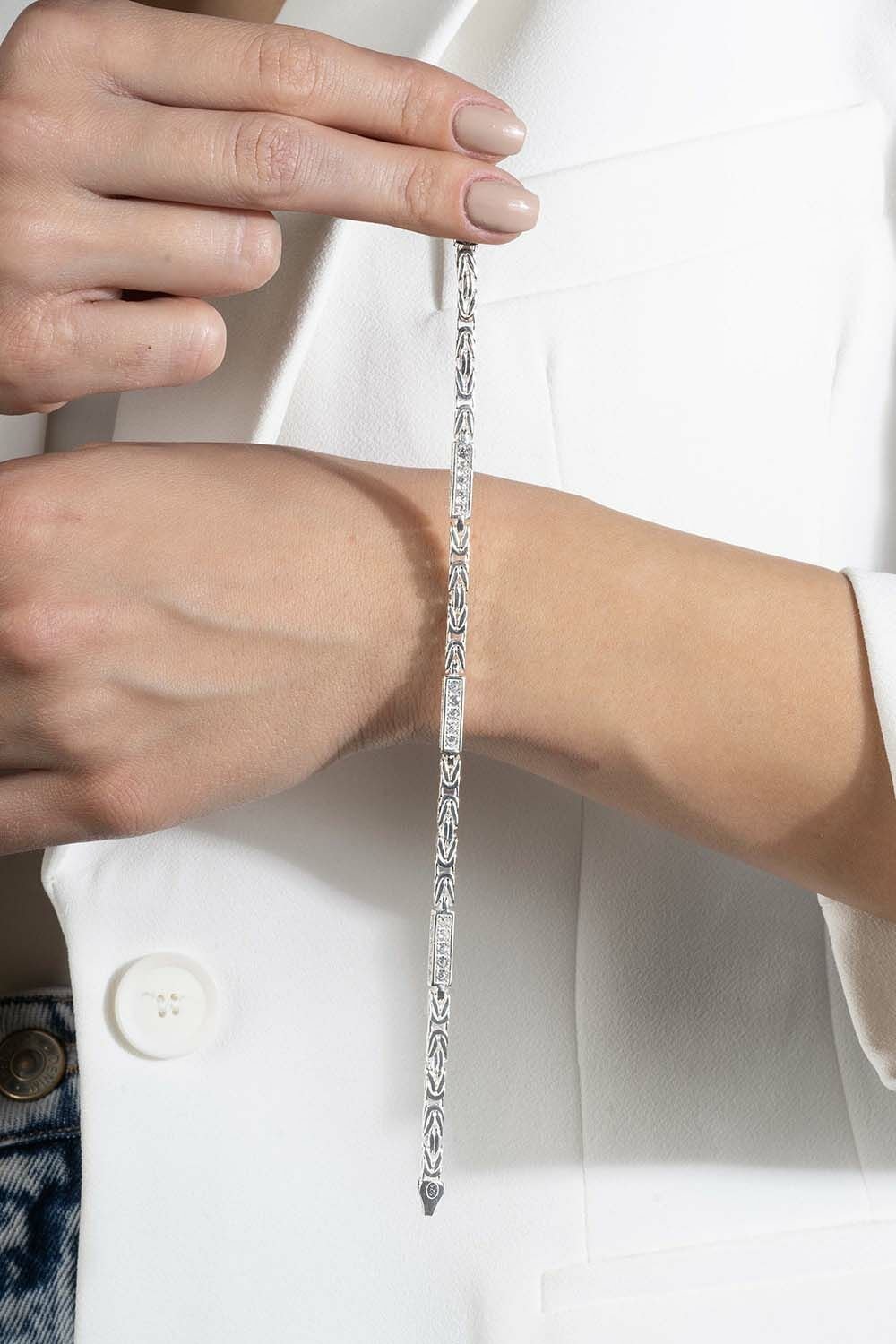 Farklı renklerde (silver, gold, rose) hazırlayabildiğimiz, klasik desenlere sahip gümüş zincir bileklik modelimiz. Bileklik, 925 ayar gümüş ile imal edilmiştir. Sipariş verildikten sonra 1-2 iş günü içerisinde kargoya verilir.