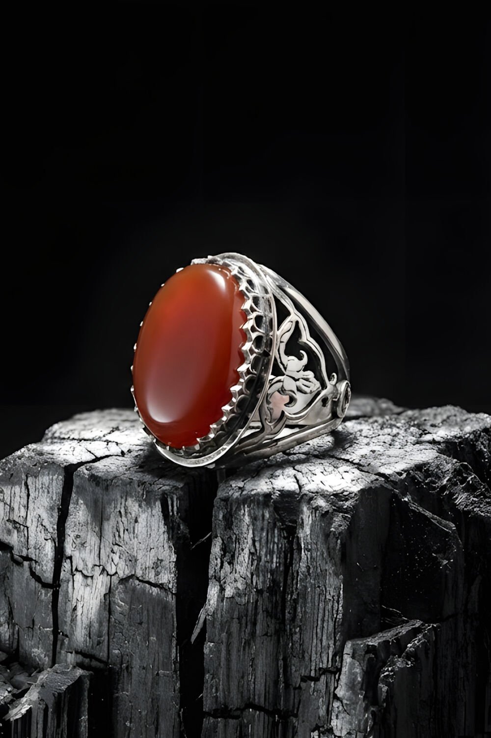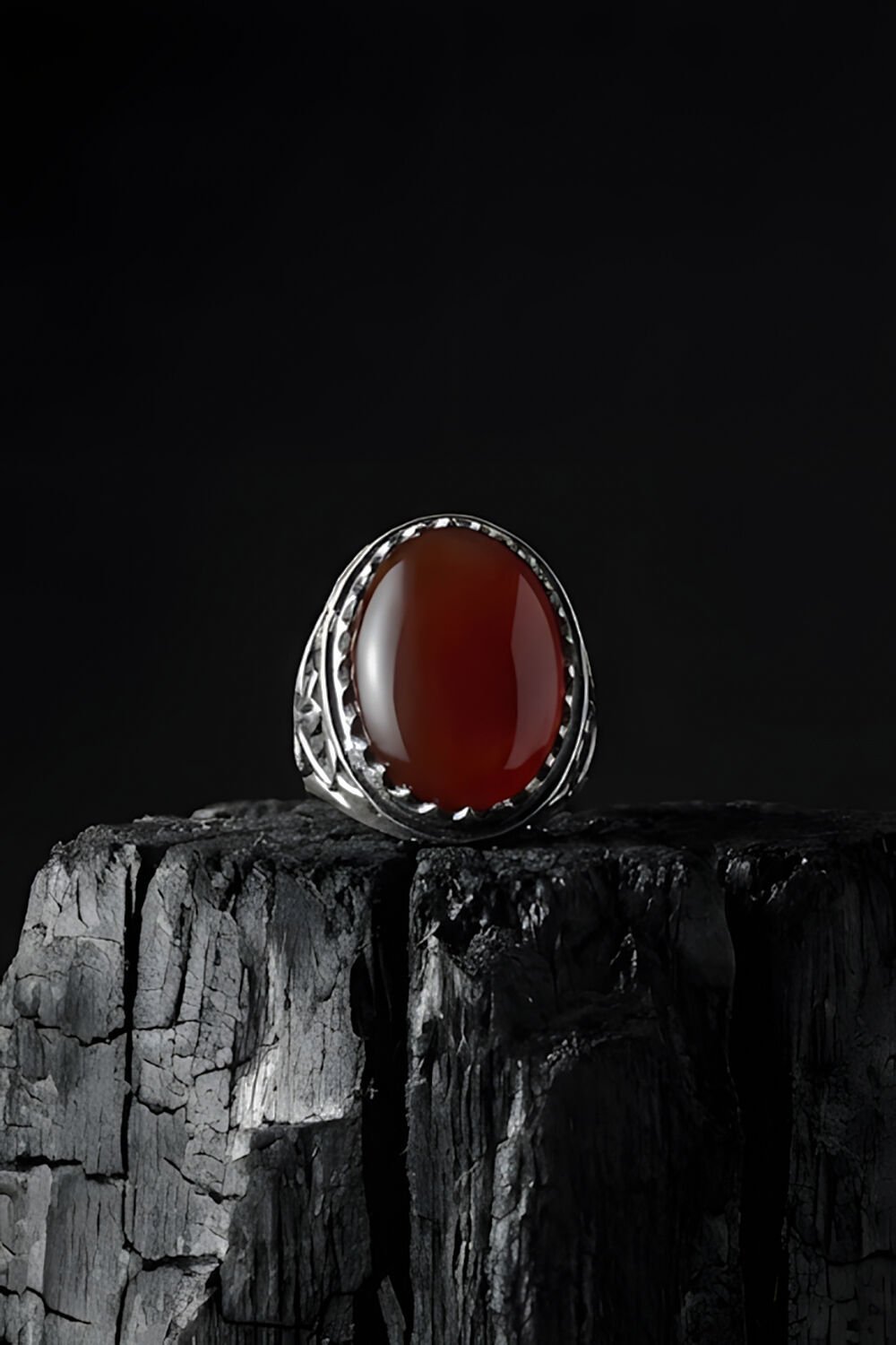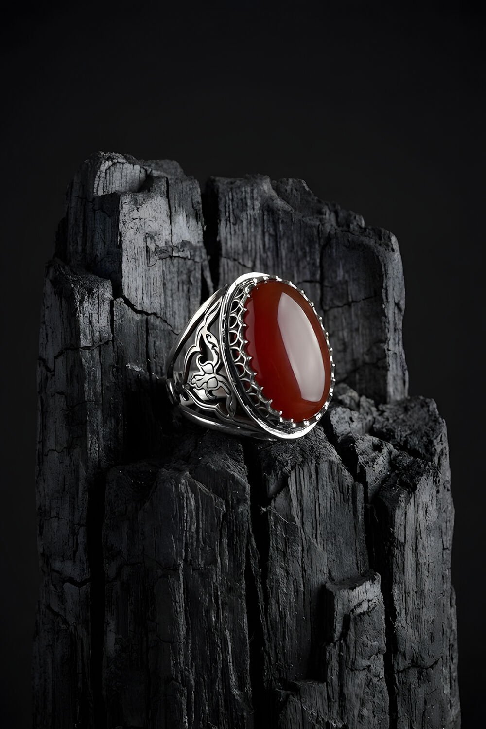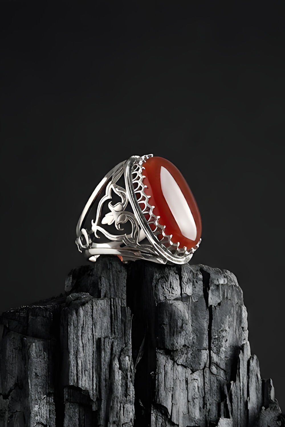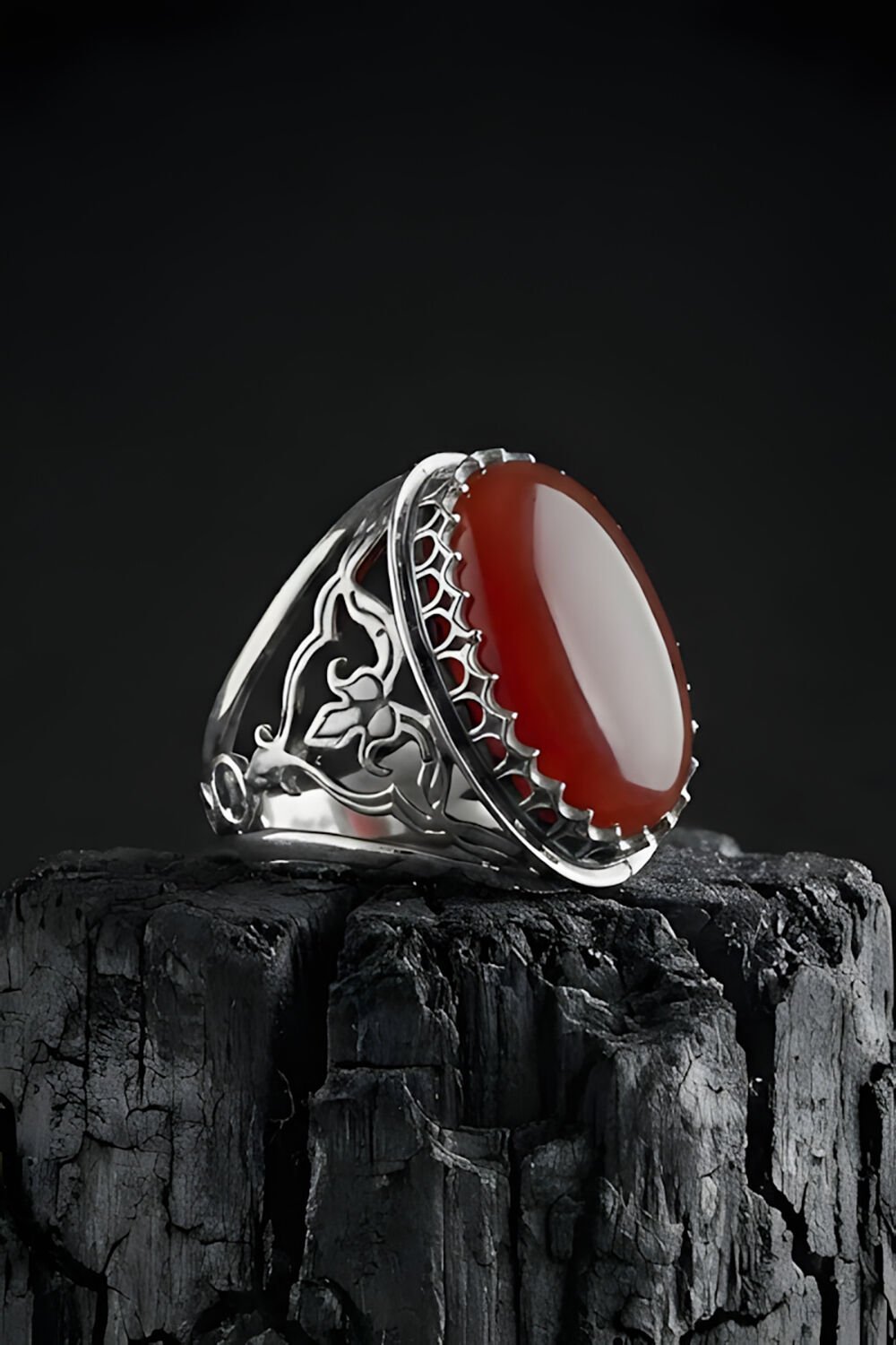 Ters Lale İşlemeli El İşçiliği Kırmızı Akik Taşlı 925 Ayar Gümüş Erkek Yüzük