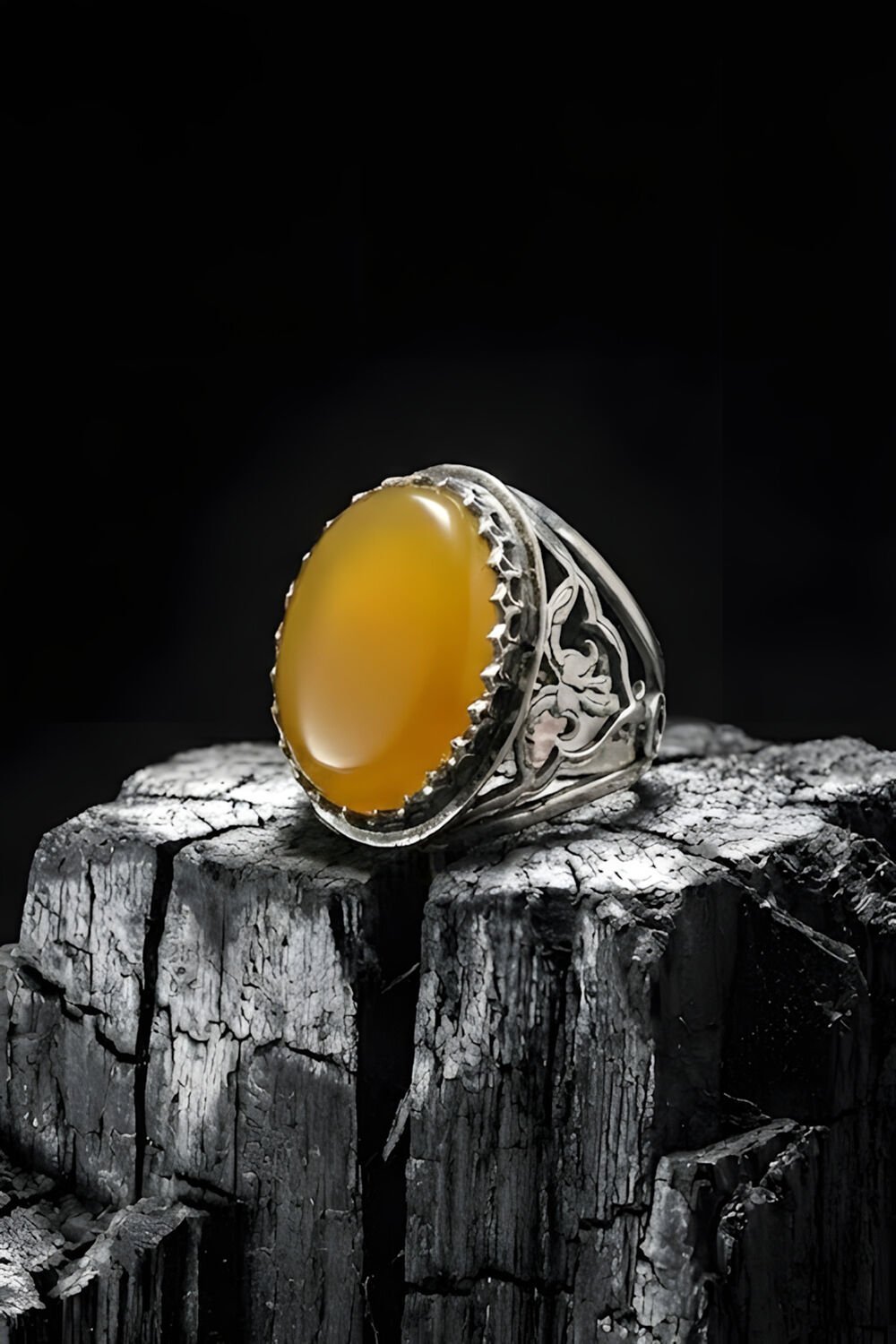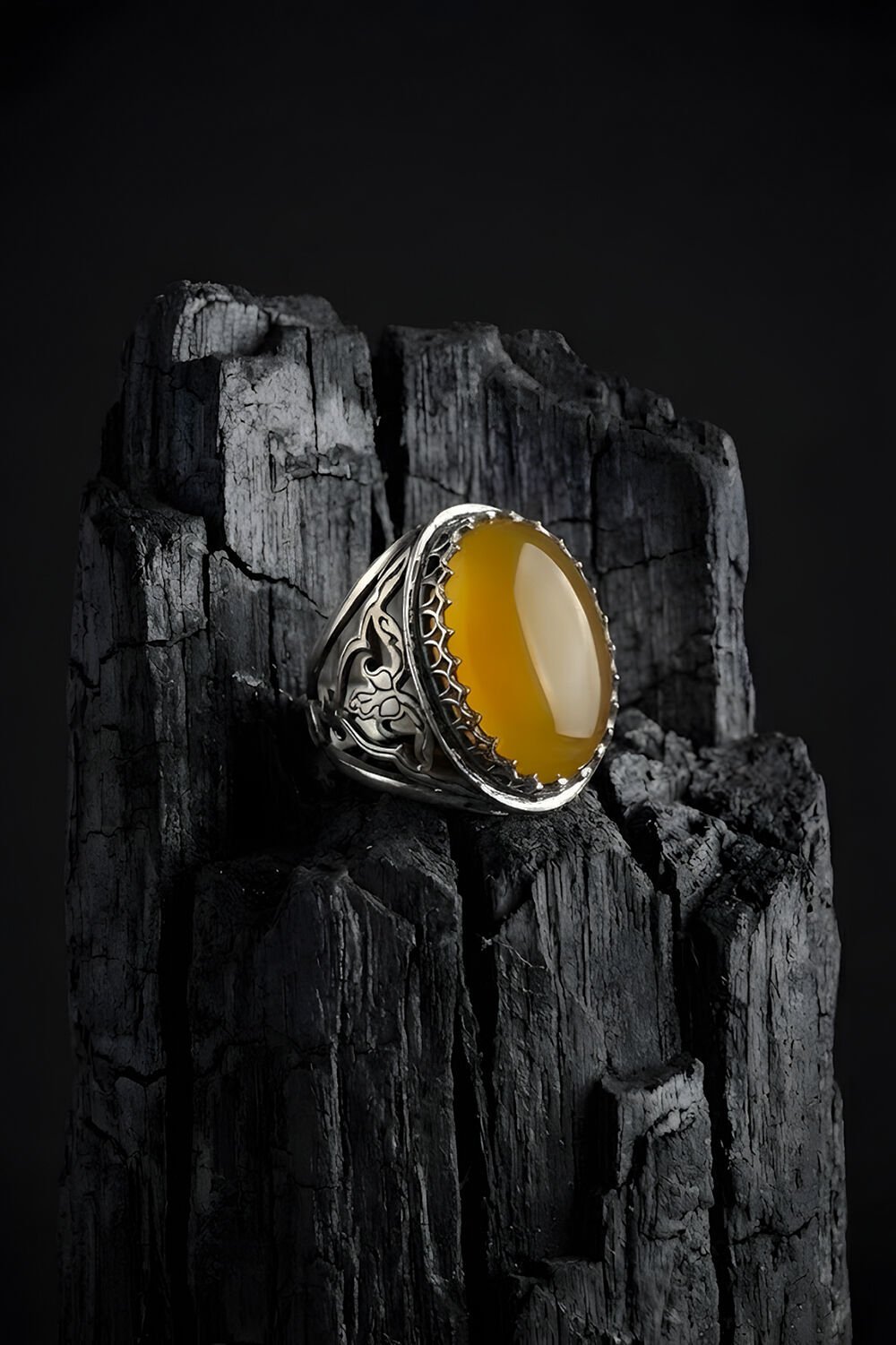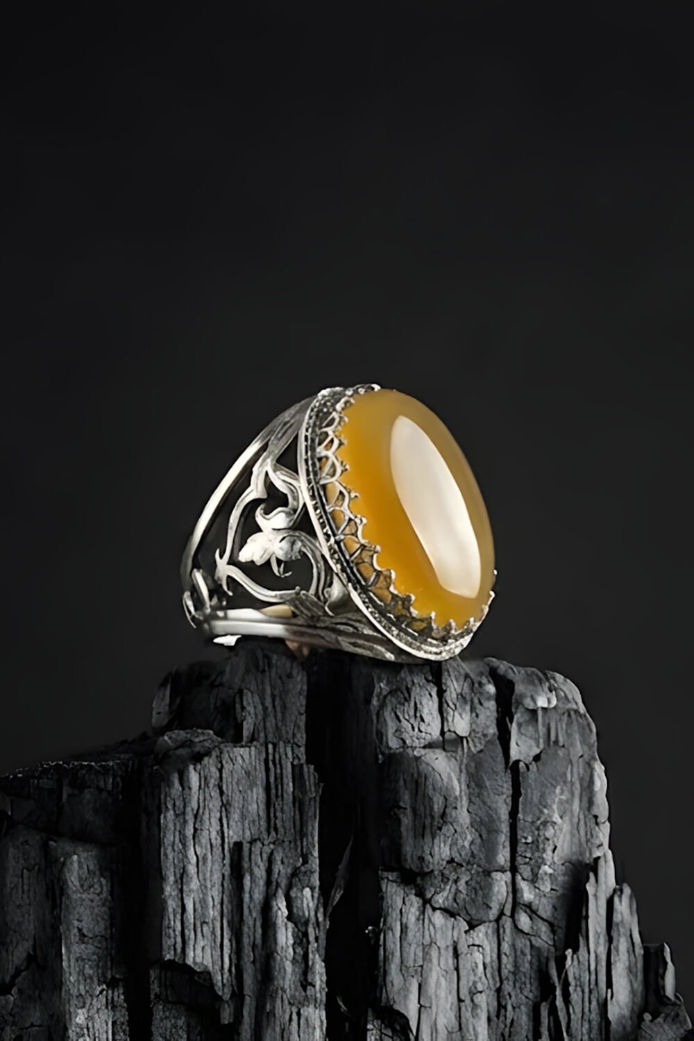 Ters Lale ve Sarı Akik Taşının Anlamı: Yüzüğün yan kısımlarına titizlikle işlenen Ters Lale (Ağlayan Gelin) motifi; hüznü, asaleti ve derin bir sadakati temsil eder. Merkeze yerleştirilen doğal sarı akik taşı ise canlı rengiyle dikkat çekerken; enerjiyi dengeleme, özgüveni artırma ve zihin dinginliği sağlama özellikleriyle bilinir.