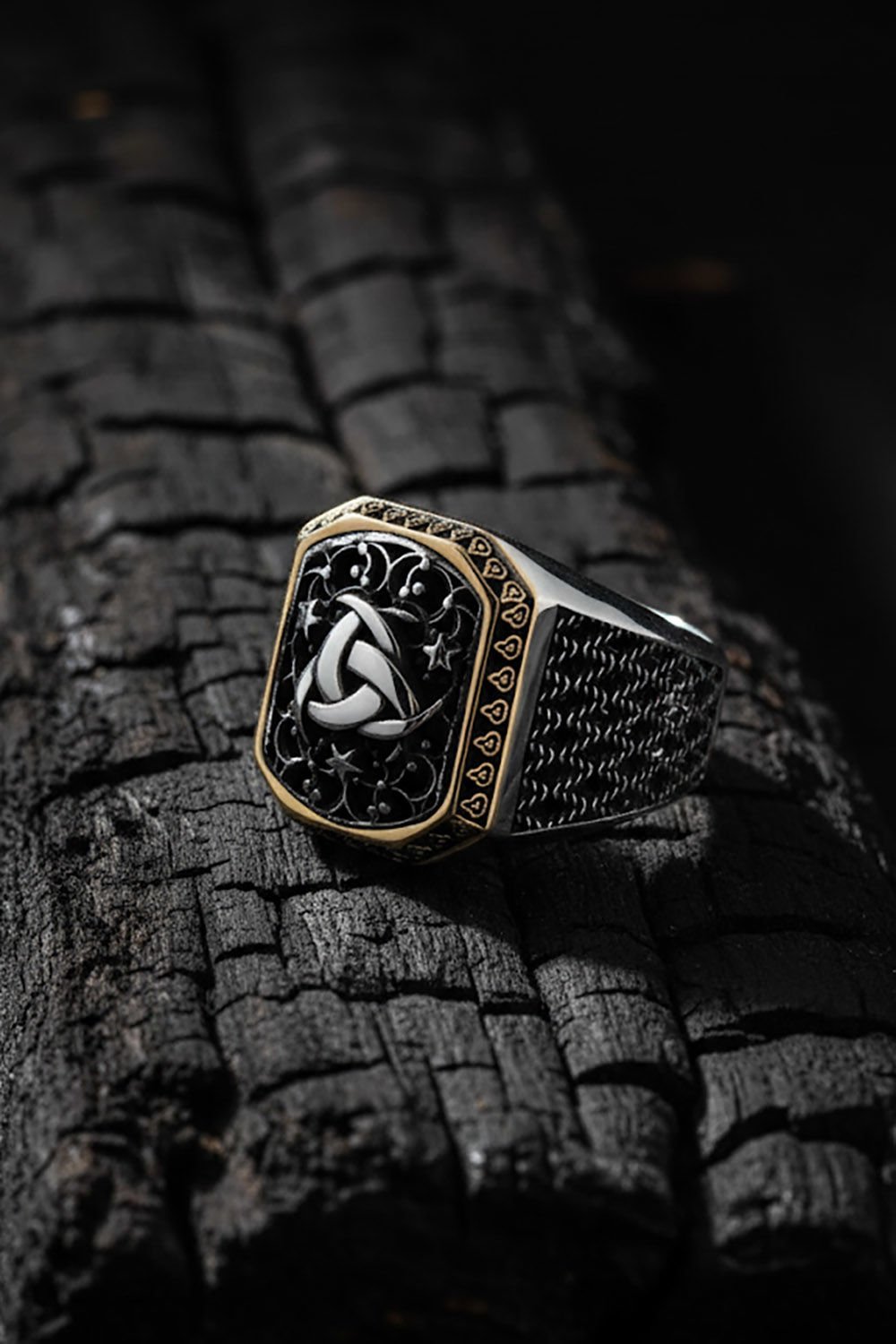 Yüzük, kenar kısımlarındaki işlemeleri ve minimal tasarımı ile dikkat çekmektedir.