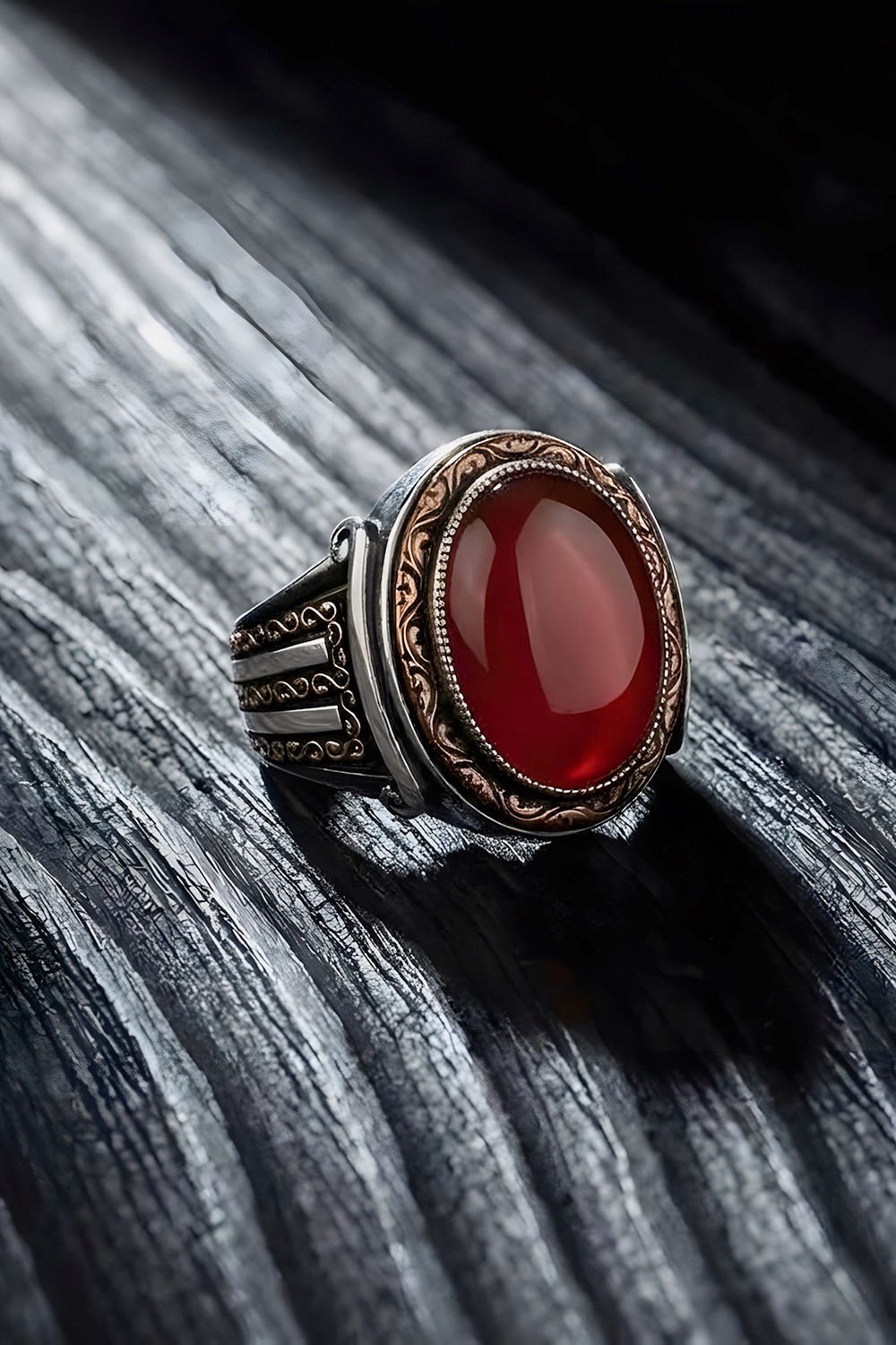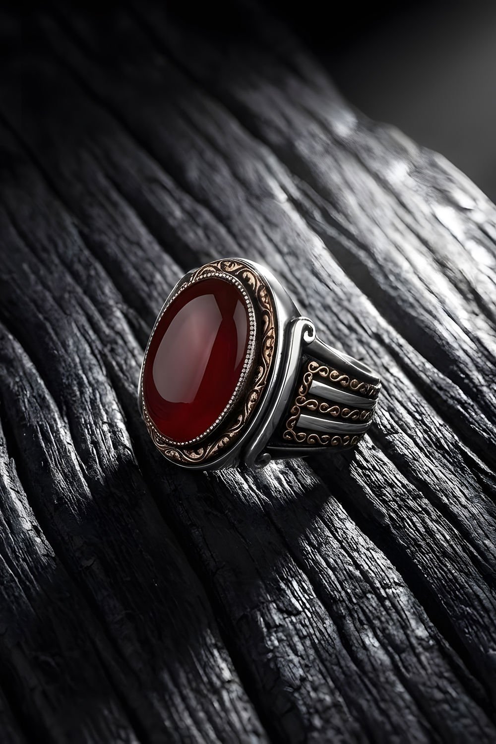 Doğal Akik Şifası: Manevi huzur, sabır ve koruma sağladığına inanılan Doğal Akik, yüzüğün kalbinde tüm doğal ışıltısıyla yer alır. Her bir taşın kendine has hare yapısı ve sıcak tonları, yüzüğünüzü size özel bir parmak izine dönüştürür.