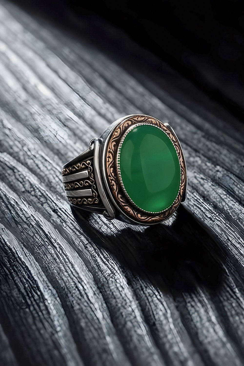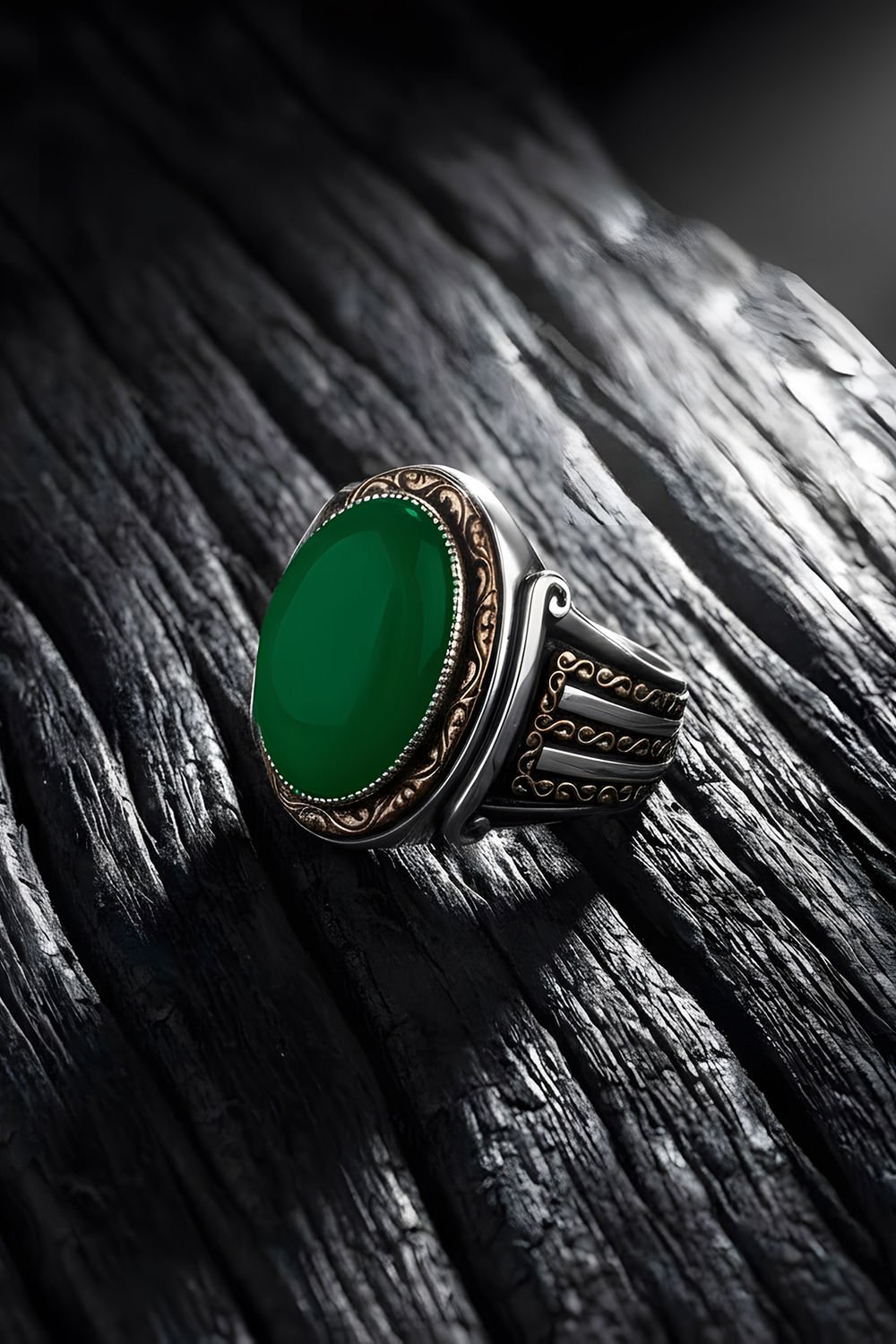 Yeşil Akik'in Huzuru: Doğal taş dünyasında "ruhsal denge ve dinginlik" kaynağı olarak bilinen Yeşil Akik, yüzüğün merkezinde tüm heybetiyle yer alır. Taşın doğal damar yapıları sayesinde her yüzük, sahibine özel ve benzersiz bir kimliğe bürünür.