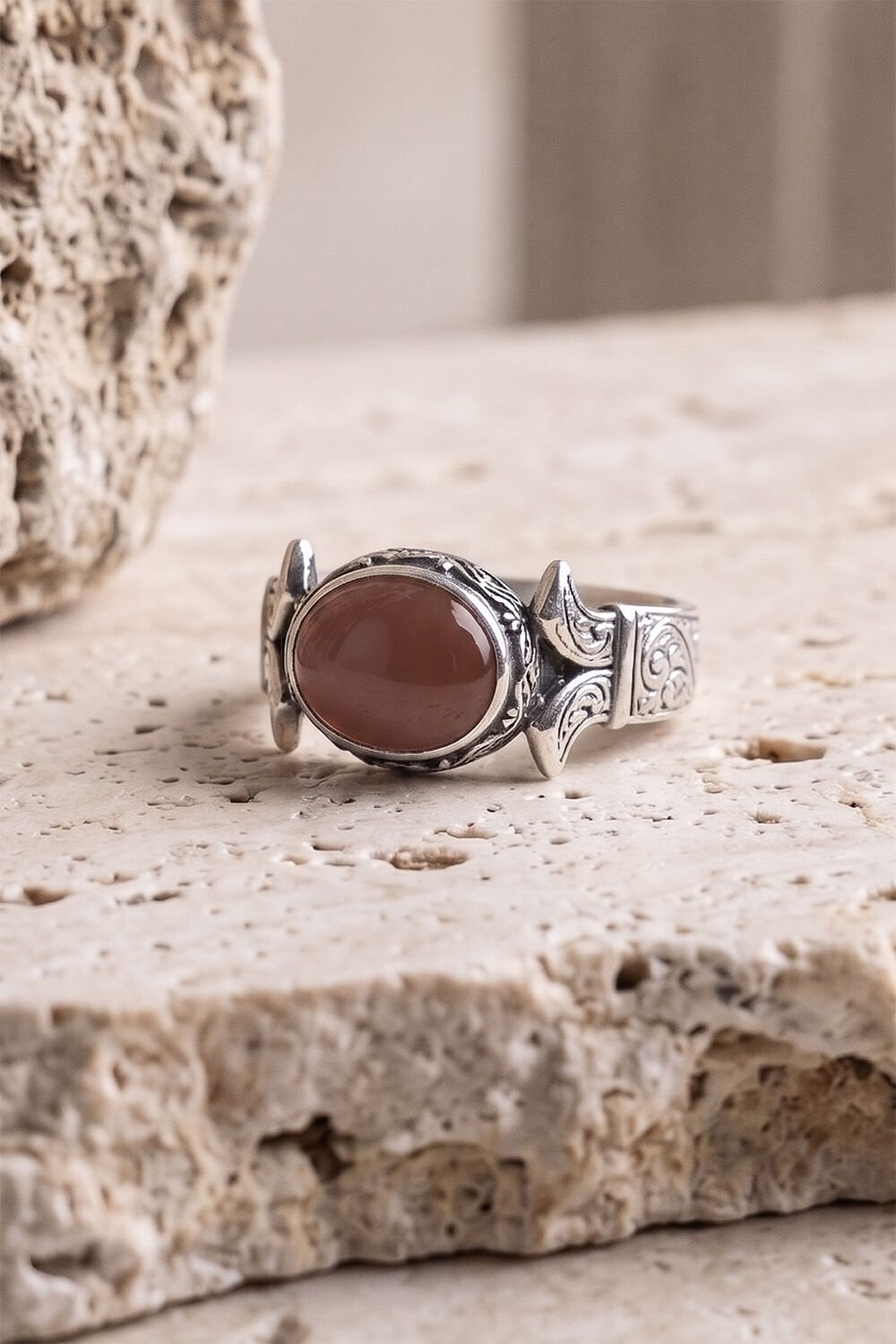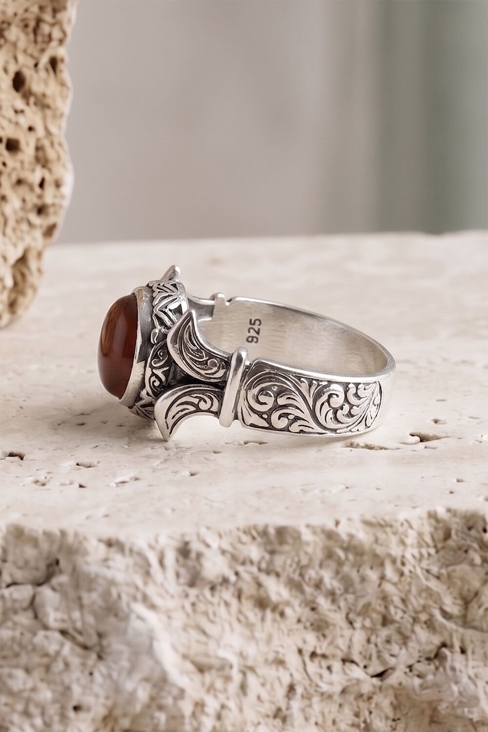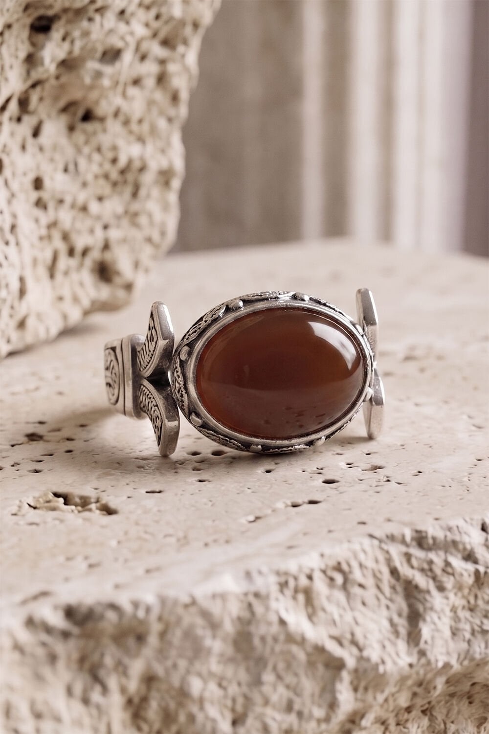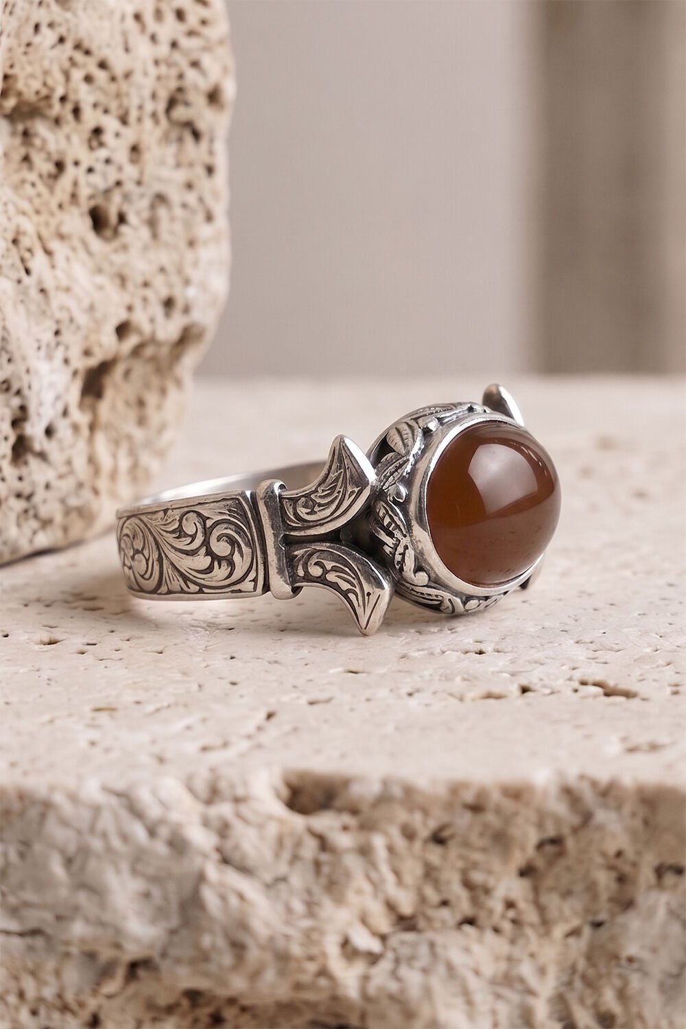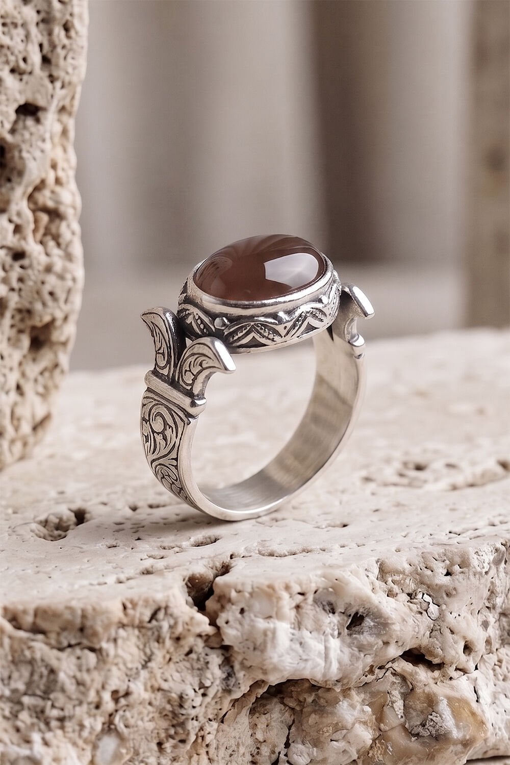 Katre Model Yan Oval Akik Taşlı 925 Ayar Gümüş Erkek Yüzük – El İşçiliği