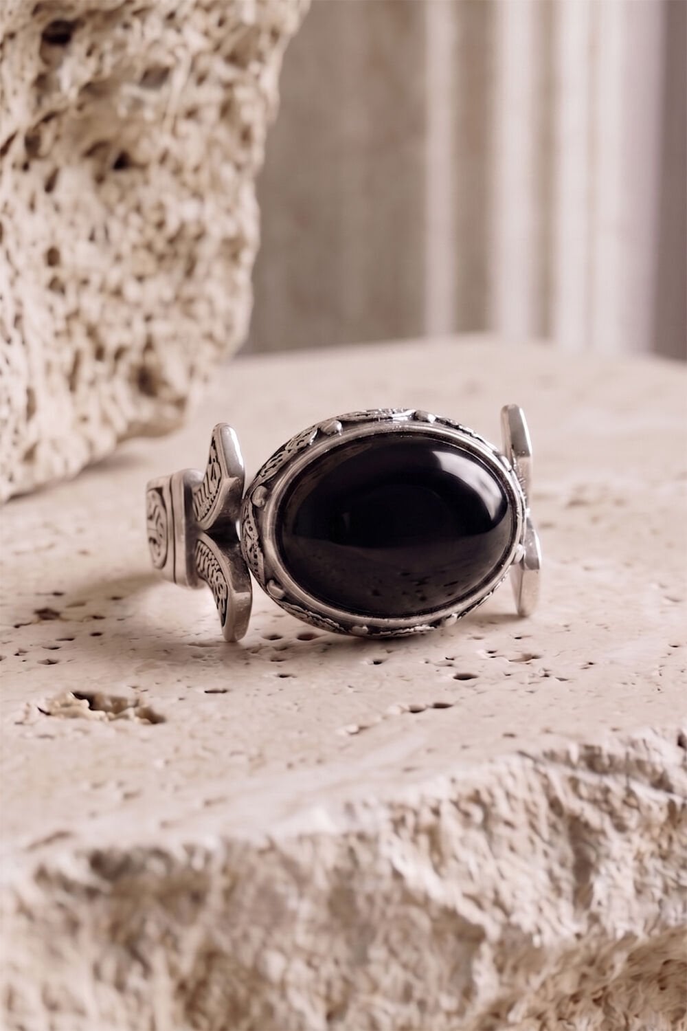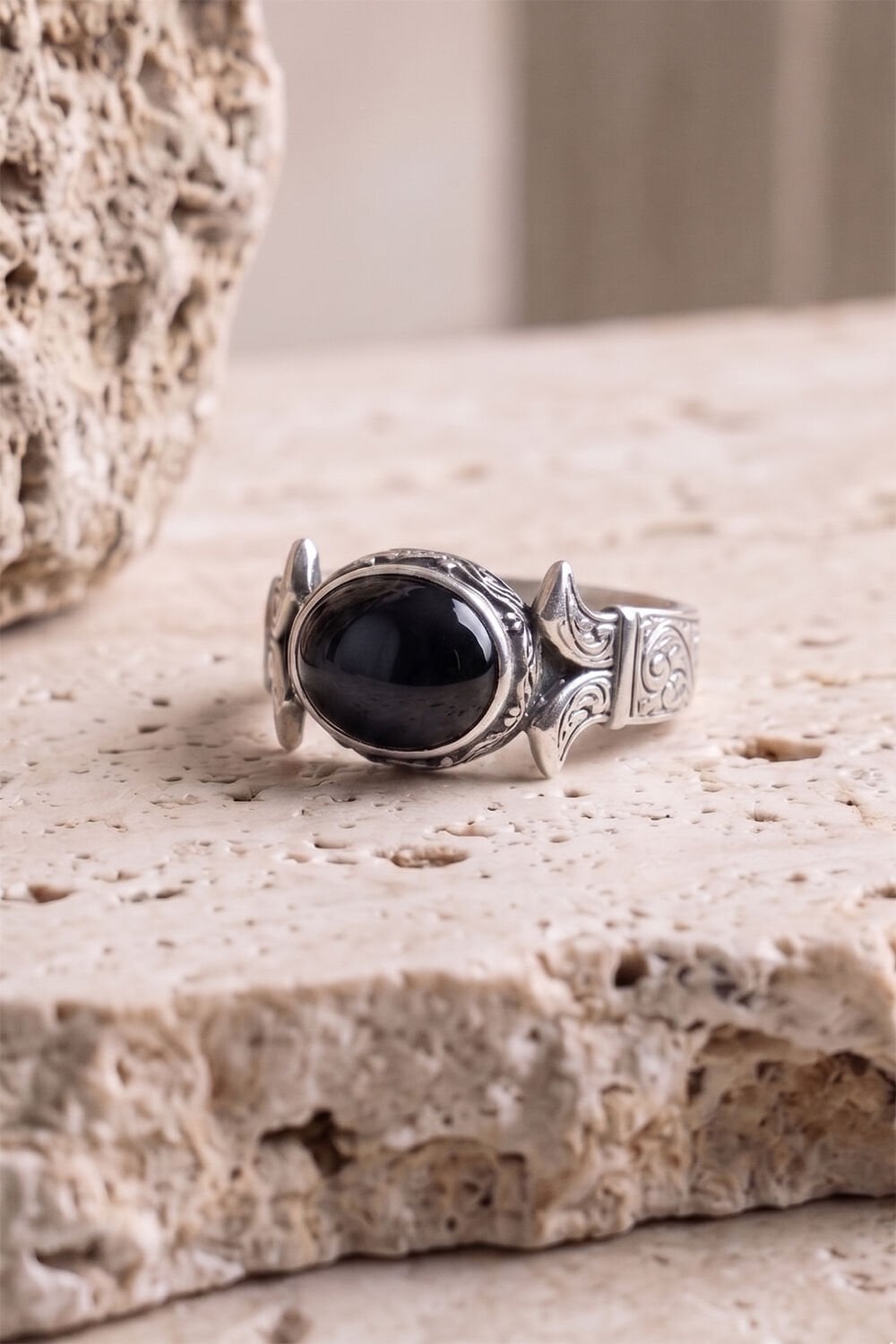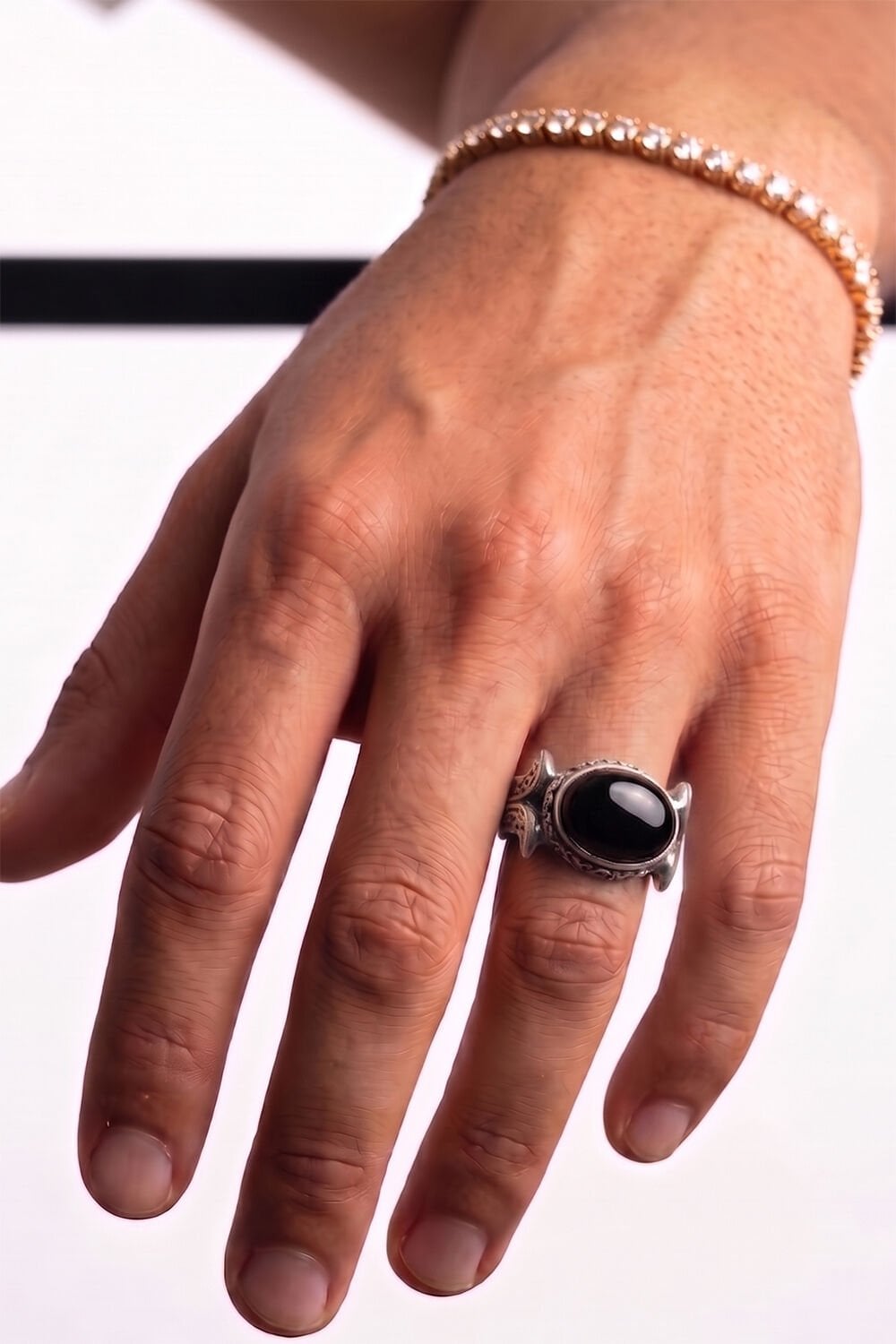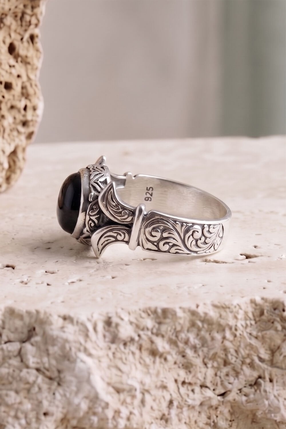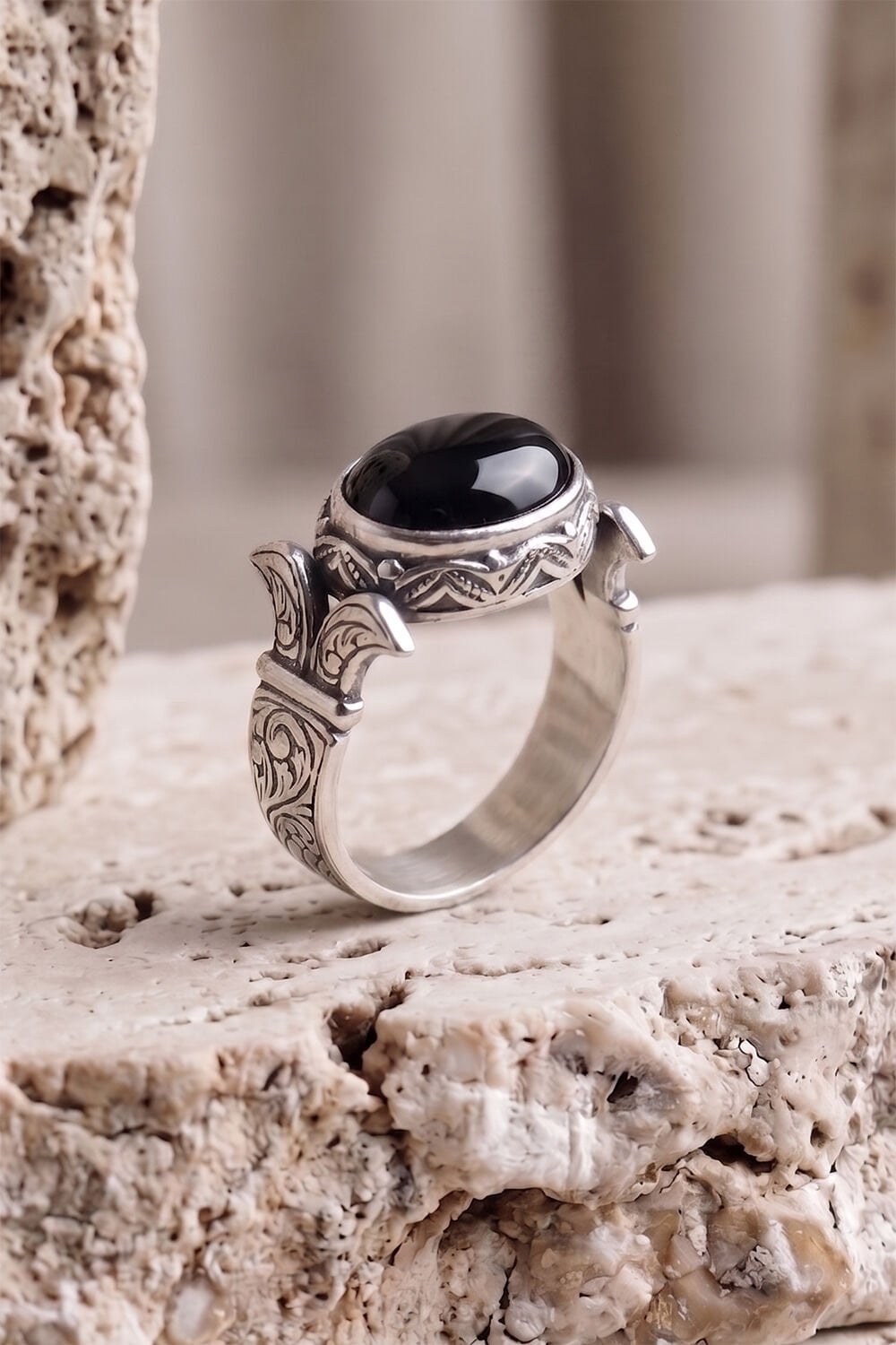 925 Ayar Gümüş El İşçiliği Oval Oniks Taşlı Katre Model Erkek Yüzük