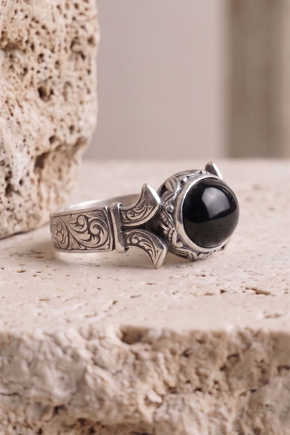 Zarafeti ve gücü parmağınızda taşıyın. 925 ayar gümüş kullanılarak tamamen el işçiliği ile titizlikle tasarlanan bu özel erkek yüzüğü, geleneksel motiflerle modern minimalizmi bir araya getiriyor. "Katre" modelinin estetik hatlarını taşıyan bu tasarım, yan bölümlerindeki ince kalem işçiliği ve üst kısmındaki asil oniks taşı ile fark yaratmak isteyen erkekler için idealdir.
