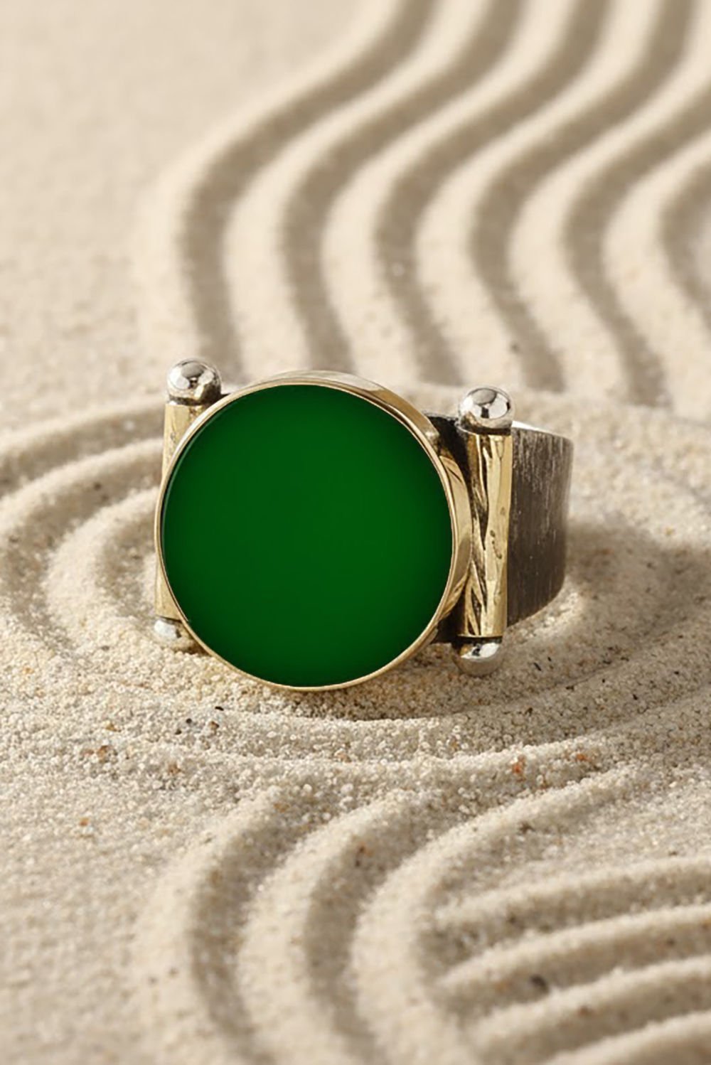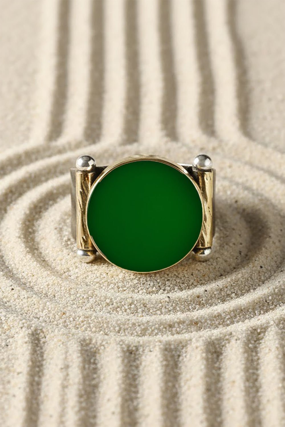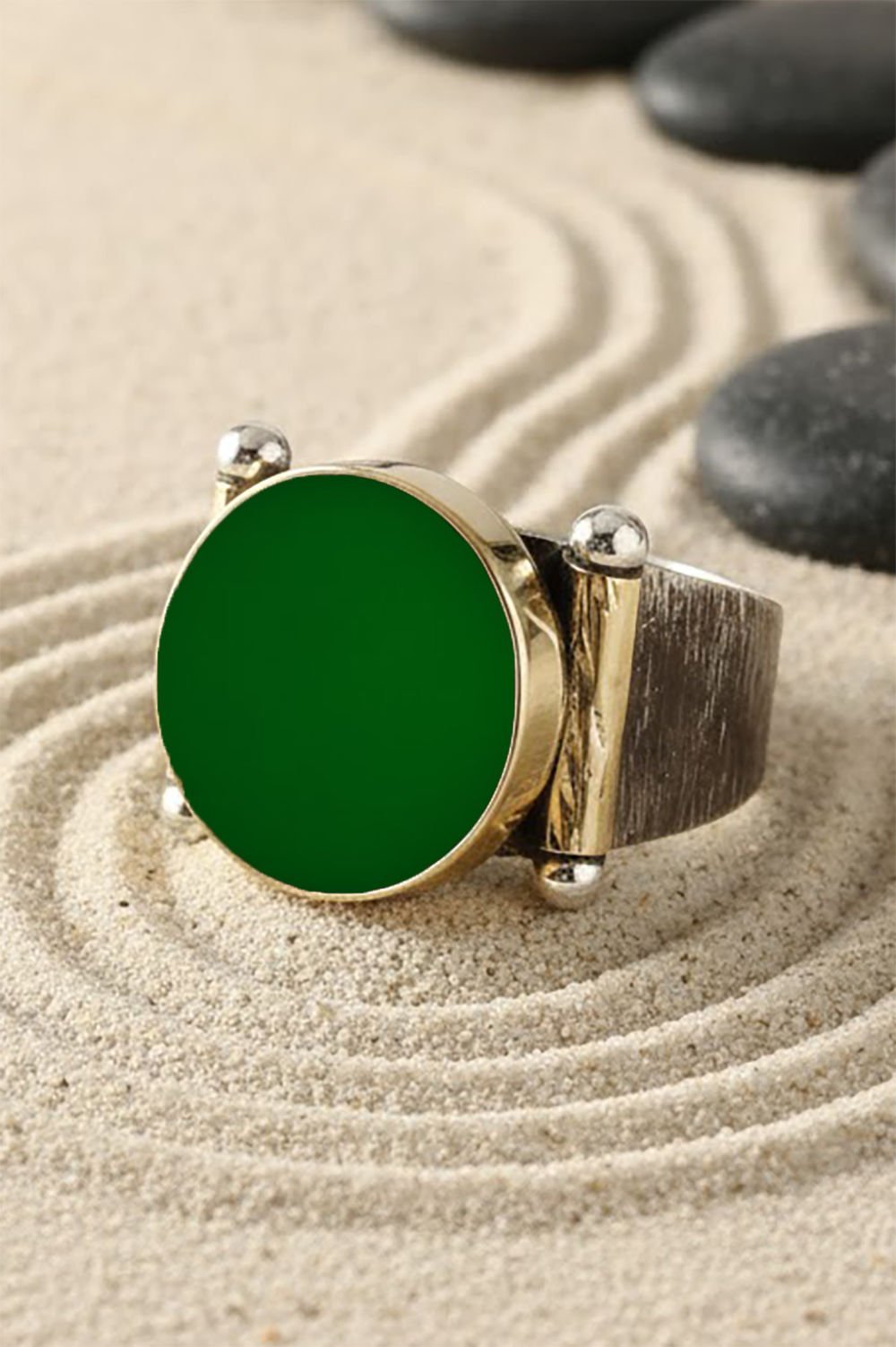 Hakiki ve orijinal doğal taşlar kullandığımız yüzüklerin bu modelinde Yeşil Akik taşını kullanıyoruz.
