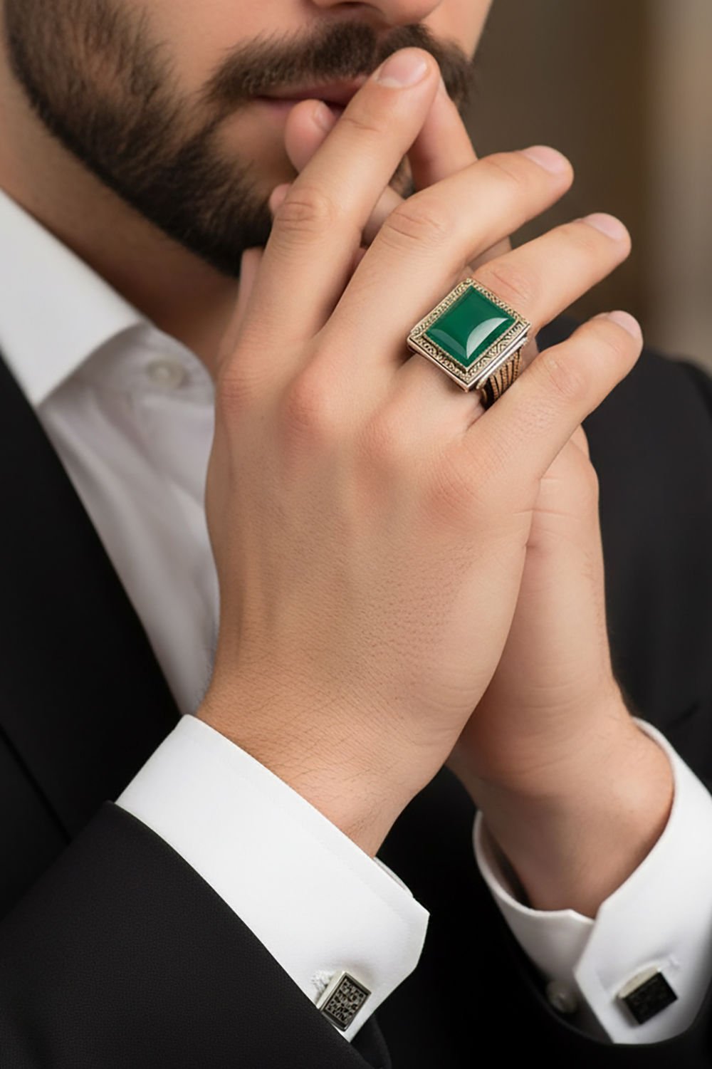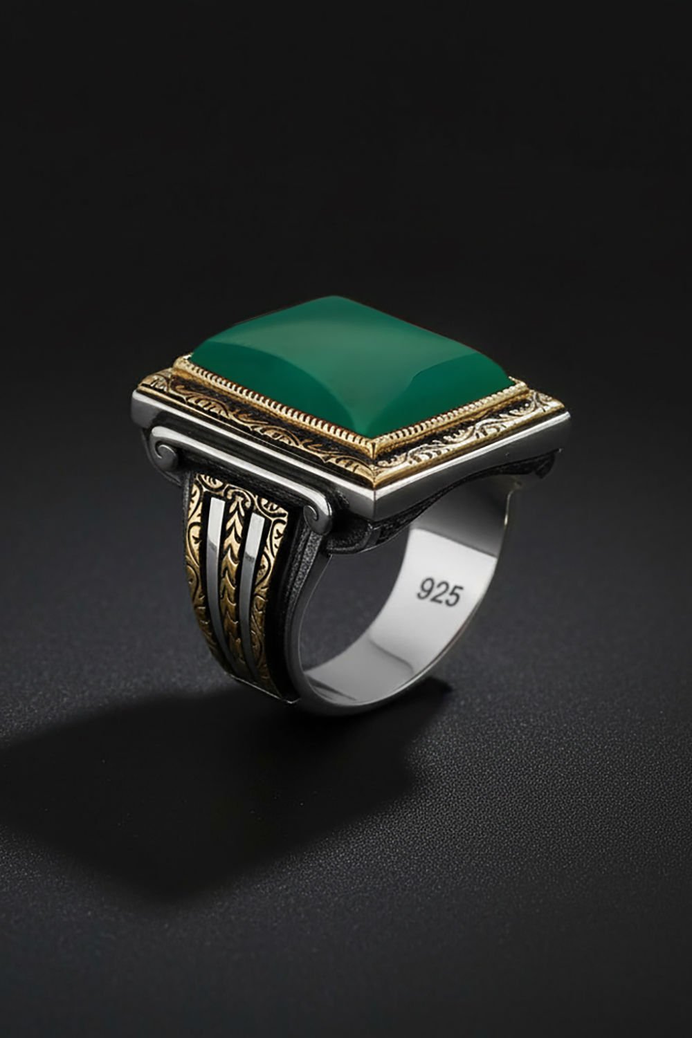 Yeşil Akik Dikdörtgen Kalem İşlemeli Gümüş Yüzük